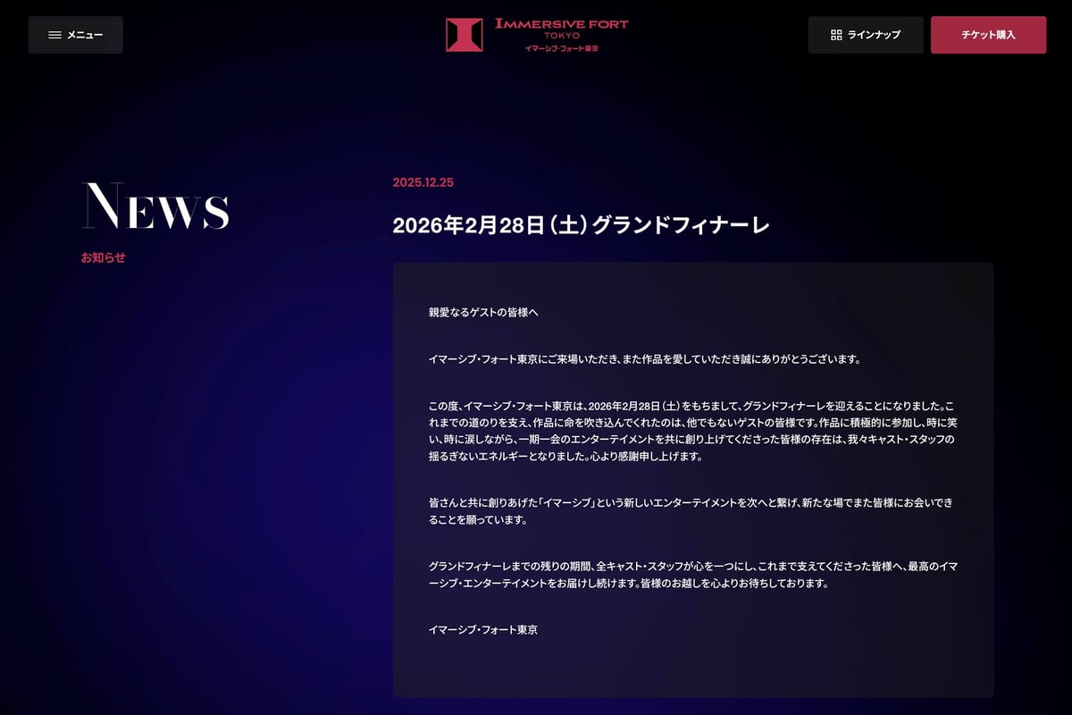 同施設は“グランドフィナーレ”を告知するページで「これまでの道のりを支え、作品に命を吹き込んでくれたのは、他でもないゲストの皆様です。作品に積極的に参加し、時に笑い、時に涙しながら、一期一会のエンターテイメントを共に創り上げてくださった皆様の存在は、我々キャスト・スタッフの揺るぎないエネルギーとなりました。心より感謝申し上げます」とコメントを寄せている。