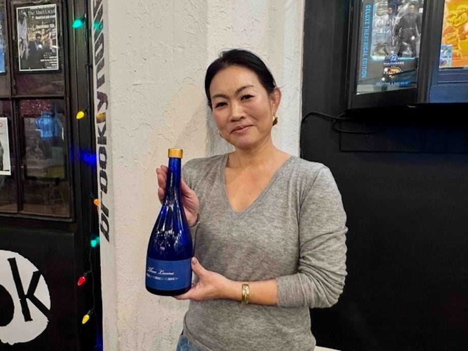 スリールームズの日本酒を持つフィッツジェラルド美都さん