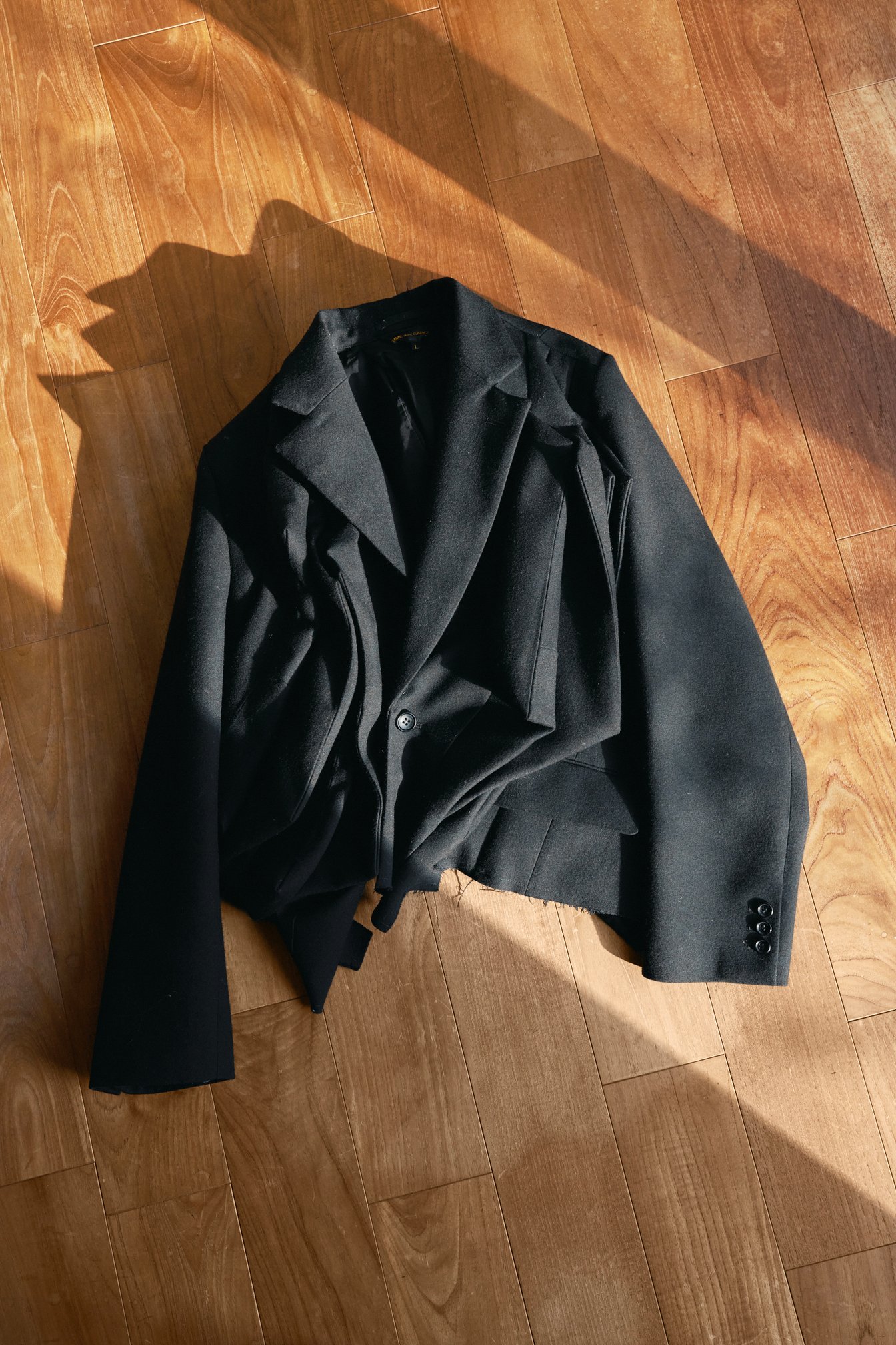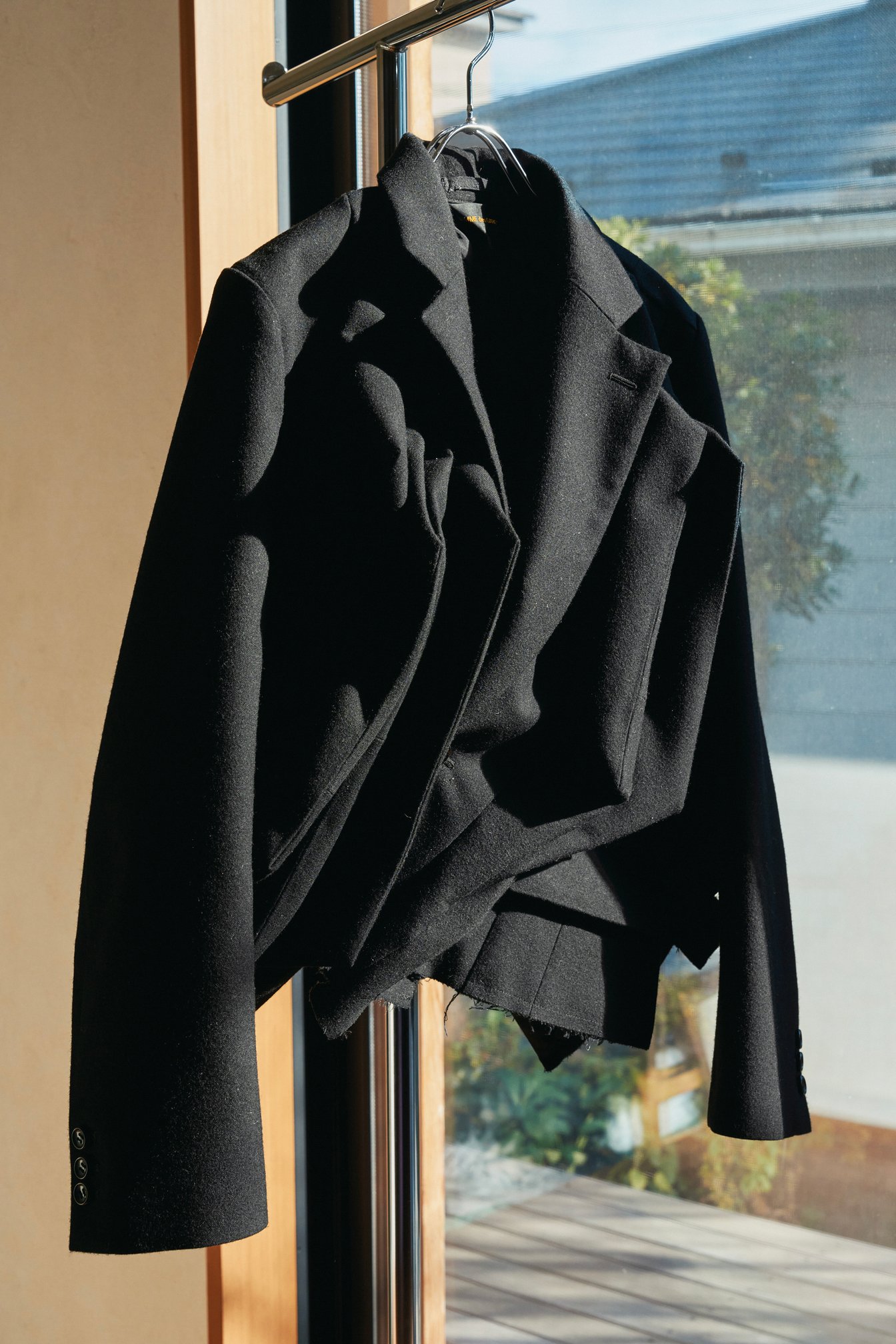 小笠原:Lサイズですが、ジャストサイズです。ラペルは普通なんですが、それ以外のパネルが全て斜めに縫い付けられているんですよ。裾もランダム丈になっていますし、おそらく2015年のパターンを再解釈して生み出されたものだと思うんですよね。