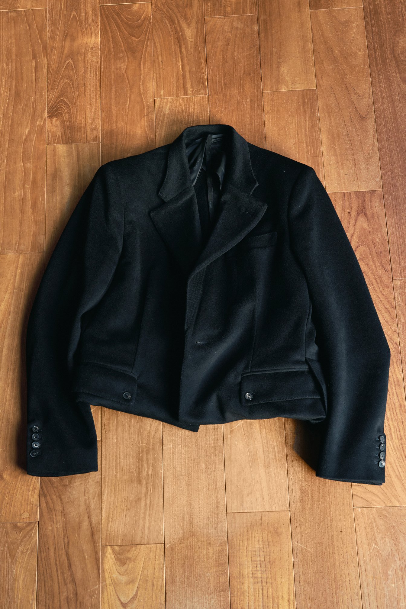 小笠原:コートいらずですね。特に日本に住んでいると、本当にコートが要らなくなってきていますよね。このジャケットは色々な着方が楽しめるようになっていて、ボタンの留め方でショート丈にもなります。まあ、この丈では着ないですけどね(笑)。裏地は省いてパイピングで仕上げ、カシミヤの風合いを楽しめる作りもいいですよね。