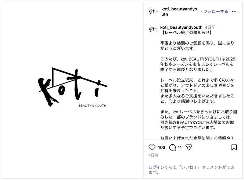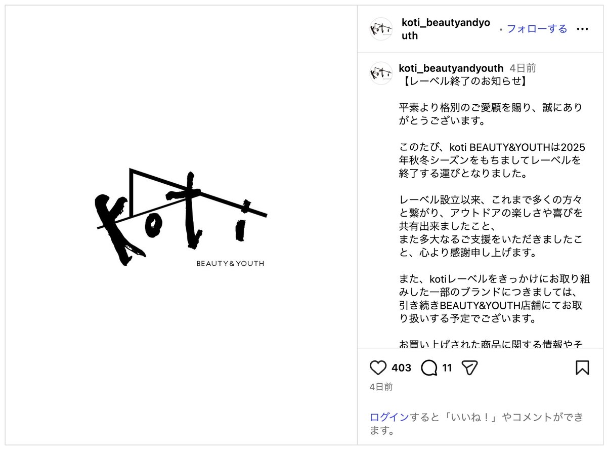 「ビューティ&ユース ユナイテッドアローズ(BEAUTY&YOUTH UNITED ARROWS、以下ビューティ&ユース)」のアウトドアレーベル「コティ ビューティ&ユース(koti BEAUTY&YOUTH、以下コティ)」が、2025年秋冬シーズンをもって終了すると発表した。在庫商品についてはシーズン中、引き続きエイチ ビューティ&ユース(H BEAUTY&YOUTH)の店舗およびユナイテッドアローズの公式オンラインストアで販売を継続するという。