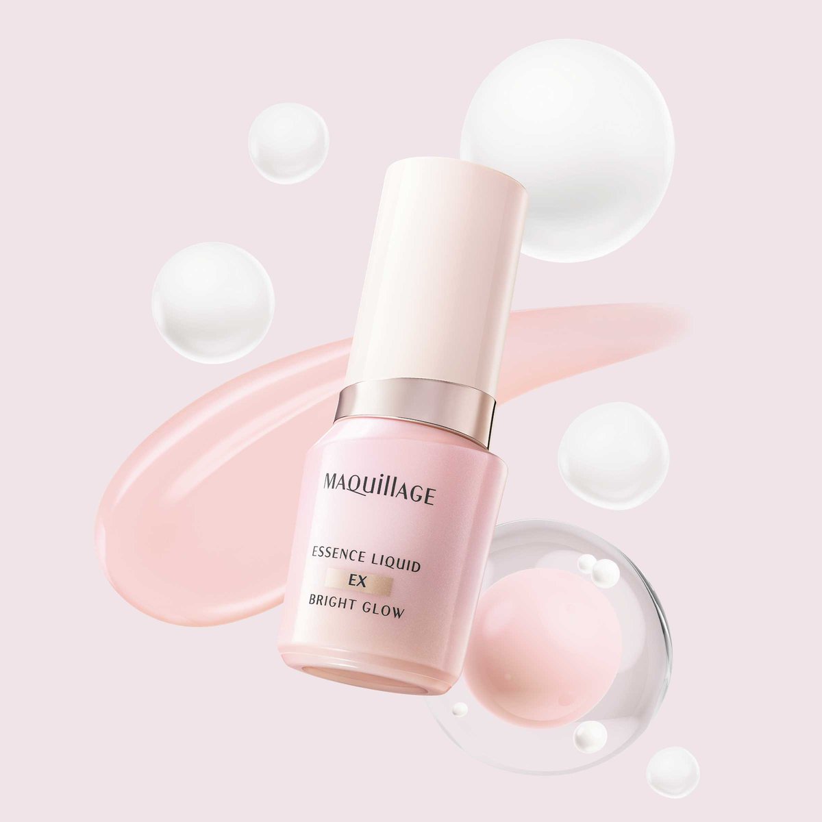 マキアージュ エッセンスリキッド EX ブライトグロウは、新たに100以上のパールから選定した「ブライトピーチパール」をブレンド。光の反射効果で血色感を追加しながらも、白浮きさせず肌になじみ、自然な素肌感を演出する。新配合の整肌・保護成分「グルタチオン」が、よりみずみずしくなめらかに伸び、消えるようにフィットするテクスチャーに。資生堂独自の「セラムファースト技術」を継続搭載。美容液がファンデーション成分を包み、つけている間美容液が肌に触れ続ける設計に仕上げた。このほか、毛穴・色ムラをフルカバーしながら透明感を引き出す「ポアレスラスティング処方」を採用した。