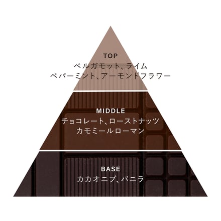 板チョコレートは、“りんごのジャムクッキー”のような味わい。カカオと砂糖のみを使用することで、シンプルで奥行きのあるほろ苦い味わいを引き出した。オサジ オードトワレ Cacao〈カカオ〉2026は、ほろ苦いチョコレートの香りを軸に、りんごを思わせるカモミールのニュアンスをプラス。ライムやベルガモットの爽やかさ、ペパーミントのアクセントを重ね、甘く余韻のある香りに仕上げている。