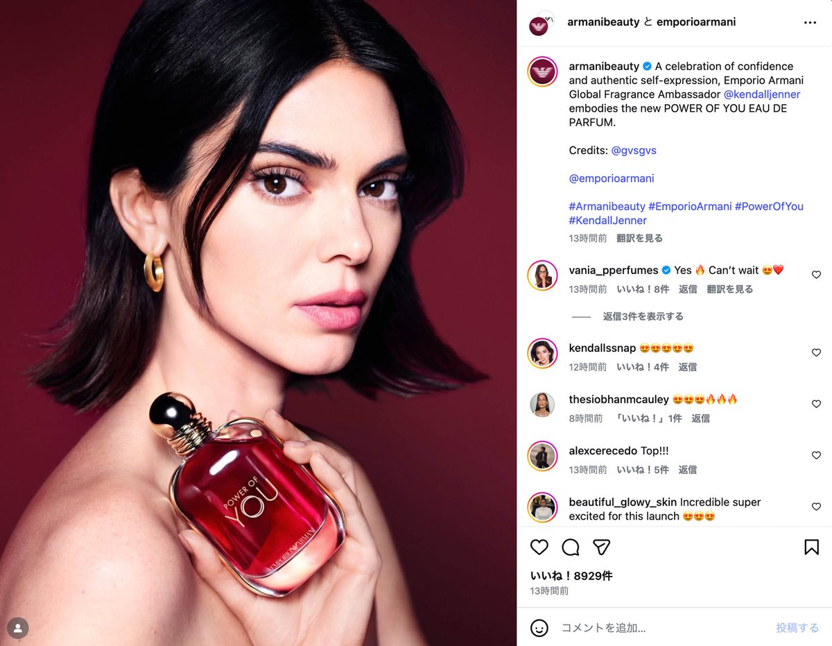 アルマーニ ビューティのインスタグラムでは、ケンダルが「ありのままの自分でいることのパワー」を体現する存在として、パワー オブ ユーの香りと共鳴すると表現した。