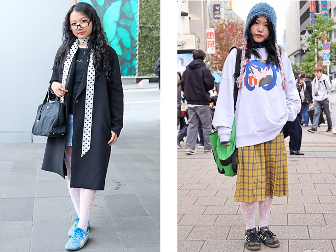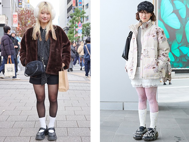 (左)「ガーリーな雰囲気は好きなので、スカートに頼らないガーリー感を目指しています」という女性(https://www.web-across.com/observe/d2lqip0000005342.html)。(右)ちょうどポップアップを開催中だったこともあってか、今月のインタビューでも多く名前の上がったIGUSAのタイツを着用していた女性(https://www.web-across.com/observe/d2lqip00000051cp.html)。