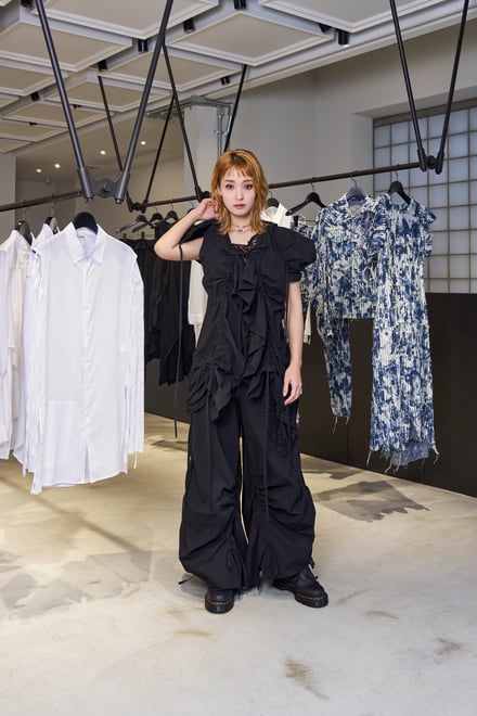 また剛力は、「日常的に既製服を選ぶ行為から生まれる意味とその創造性」をテーマにした2026年春夏コレクションから3つのルックを着用。「私にとって洋服を選ぶことは1日の始まりであり、自分を高め、自信を持たせてくれるもの。特に、黒は”憧れの自分”になれる一番好きな洋服の色です。今回最初に着させてもらった黒のトップスとパンツのルックは、かっこよさと愛らしさのバランスがすごく好きで。ゆったりしたシルエットや内側にあしらわれたレース、コードでシルエットを変えられるディテールなど、いろいろな表情を見せてくれるところが素敵だと感じました」とその魅力を語った。
