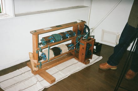 ワークショップで使われる、解かれた毛糸のクセを取るための道具「湯熨斗器(ゆのしき)」