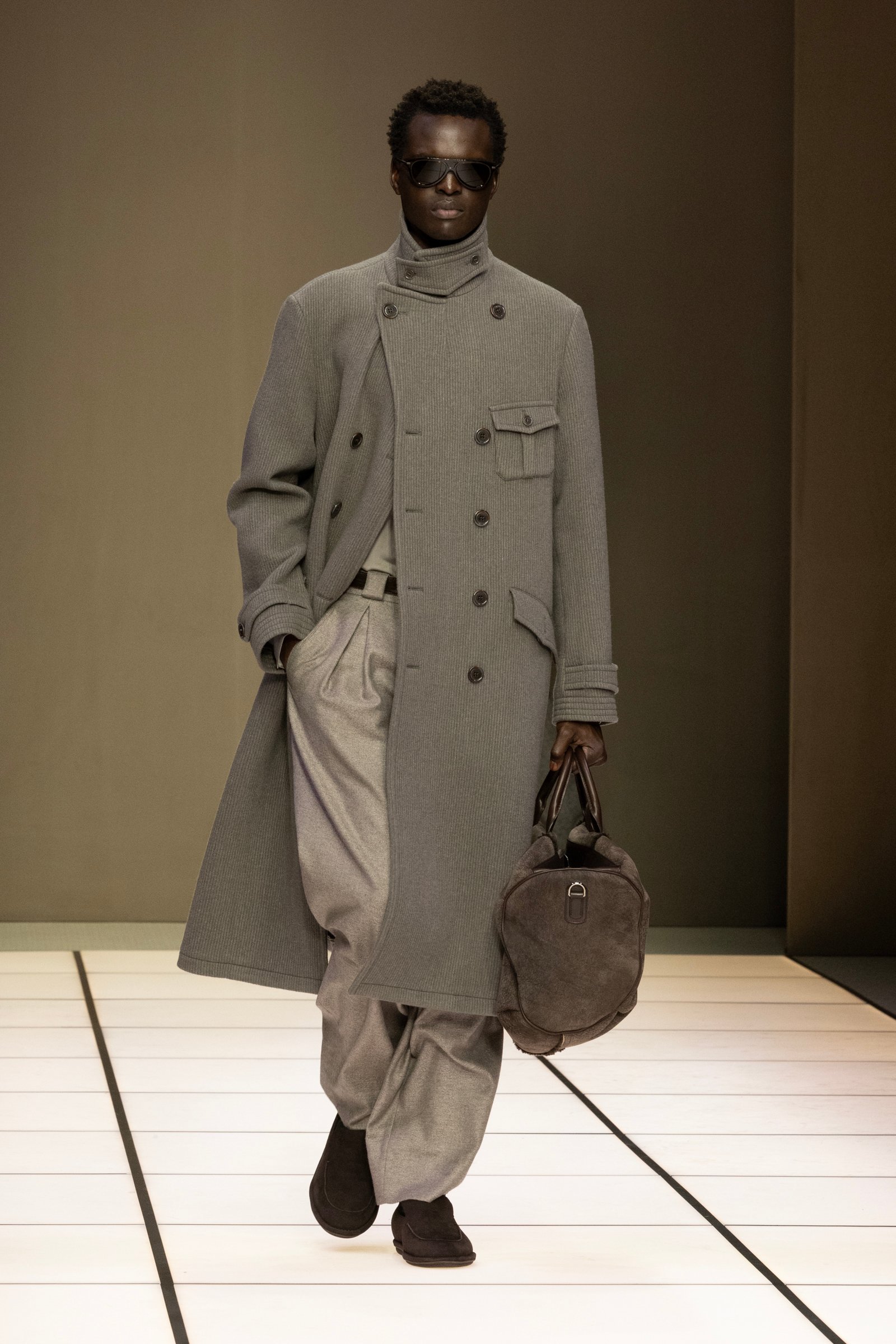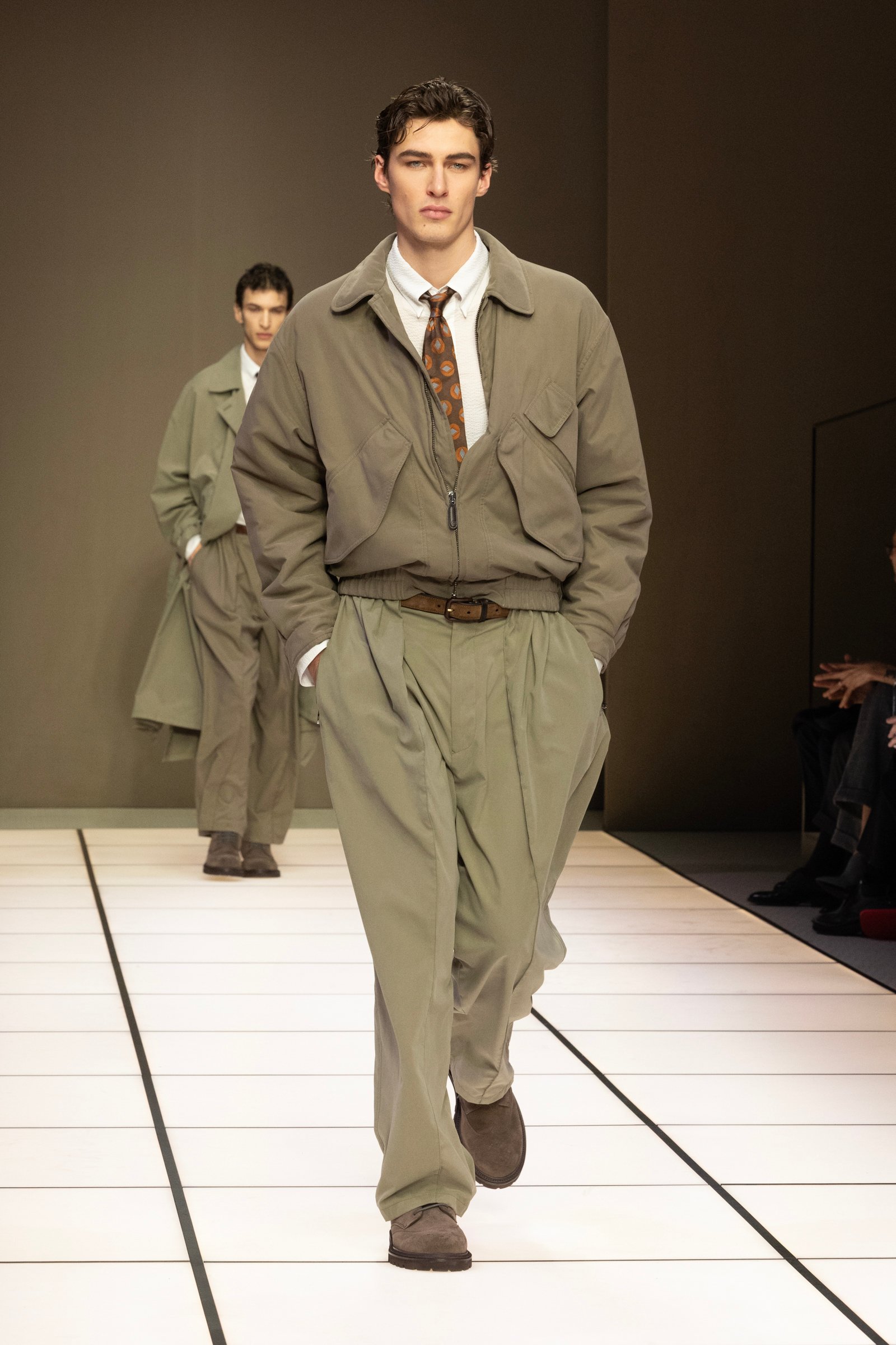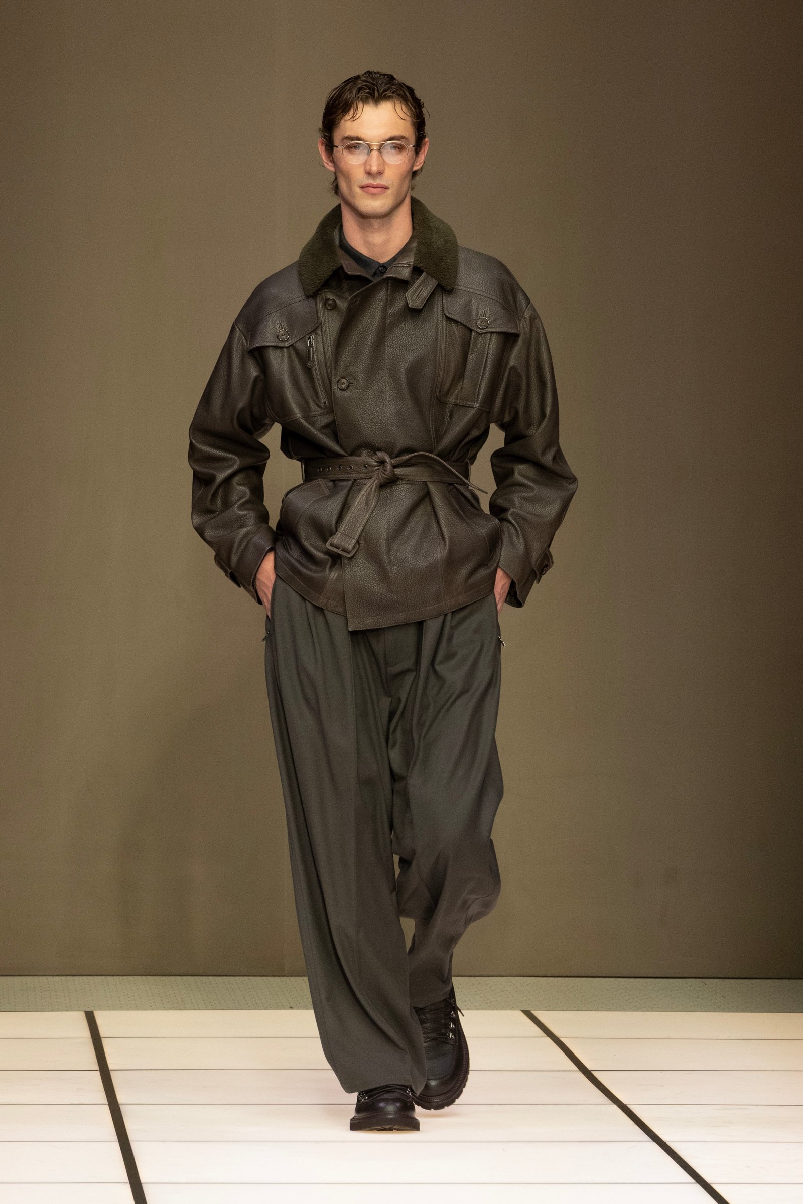2026年秋冬メンズコレクションのテーマには「CANGIANTE(カンジャンテ/玉虫色)」を掲げ、見る角度によって表情を変えながらも、その本質は決して揺るがない玉虫色の特性を、時代とともに変化しつつもアイデンティティを保ち続けるブランドのメタファーとして提示した。コレクション全体を貫くのは、ブランドの真骨頂である「イージーエレガンス」で、ランウェイにはノーカラーやスタンドカラーの滑らかなスーツや、ウール素材で仕立てたカジュアルシャツが登場。タックを入れた太畝のコーデュロイパンツや、スエードシューズにかかるワイドパンツが、肩肘を張らない軽快さを演出した。また、ウエストマークされたレザーブルゾンや濃いグリーンのベロアジャケット、上品なスエードコートなど、素材の質感を活かしたアウターウェアも充実。ダブルのスーツやモヘア調のジャケットなど、クラシックなアイテムも現代的な解釈で製作された。