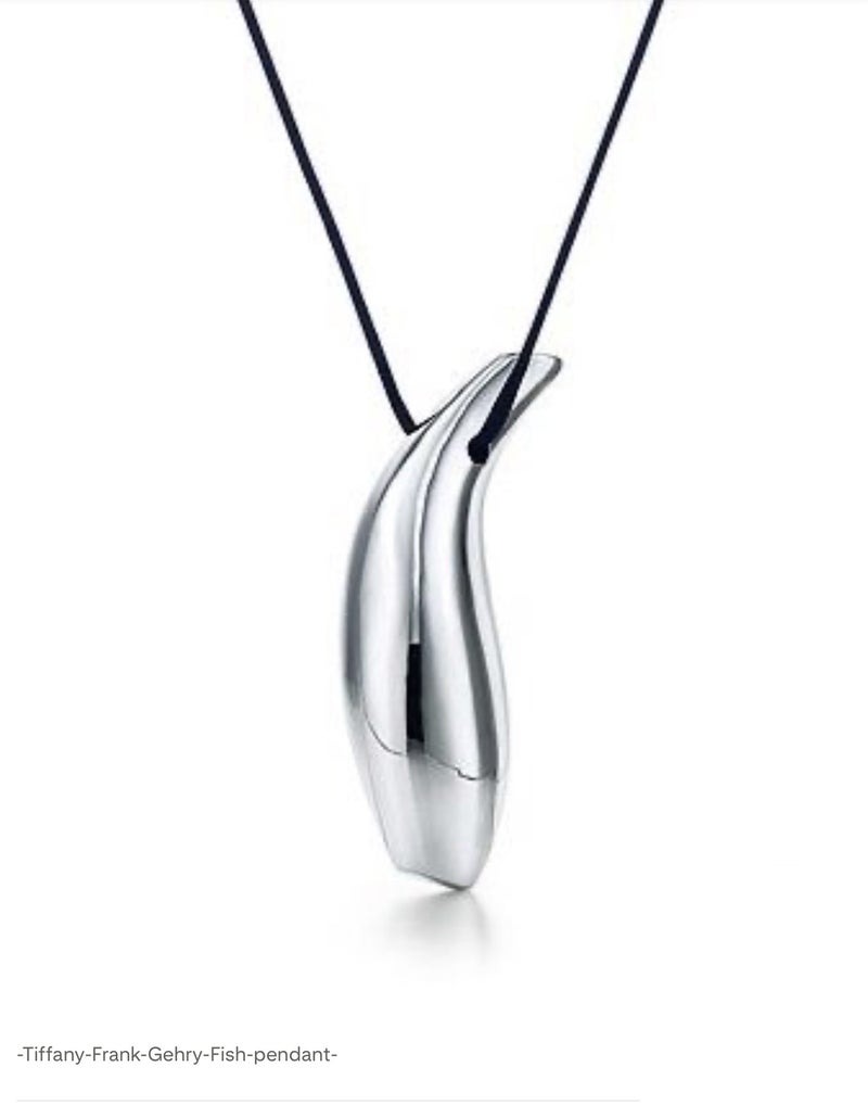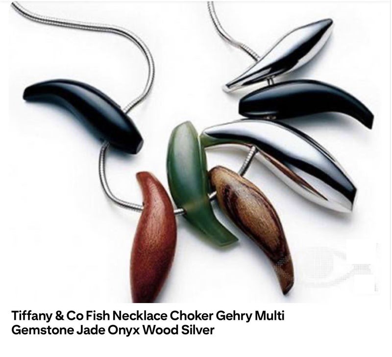 ジュエリーは立体的な形状をしている点ではプロダクトデザインであり、時が流れるにつれて色・艶が変化し、独特な趣が出てくるところはタイムデザインと言えなくもない。つまり、ゲーリー氏は建築を専攻する中で、立体のフォルム作りをしっかり勉強して来たのだから、自由な発想で様々なものに投影するとすれば、ジュエリーのようなプロダクト&タイムデザインも可能だったと言える。そうした同氏の素養というか、才能をティファニーが見抜き、デザイン戦略の活性化を進める中で、白羽の矢を立てたのではないか。最初、ゲーリー氏がデザインしたジュエリーを見た時は感じなかったが、今改めてその時の写真を見返してみると、シルバーやジェムストーン、翡翠などの素材である形が表現されているように見えてくる。「魚」である。それらは輝くプロダクトデザインというか、タイムデザインの煌めきといったキャッチコピーがしっくりくる。
