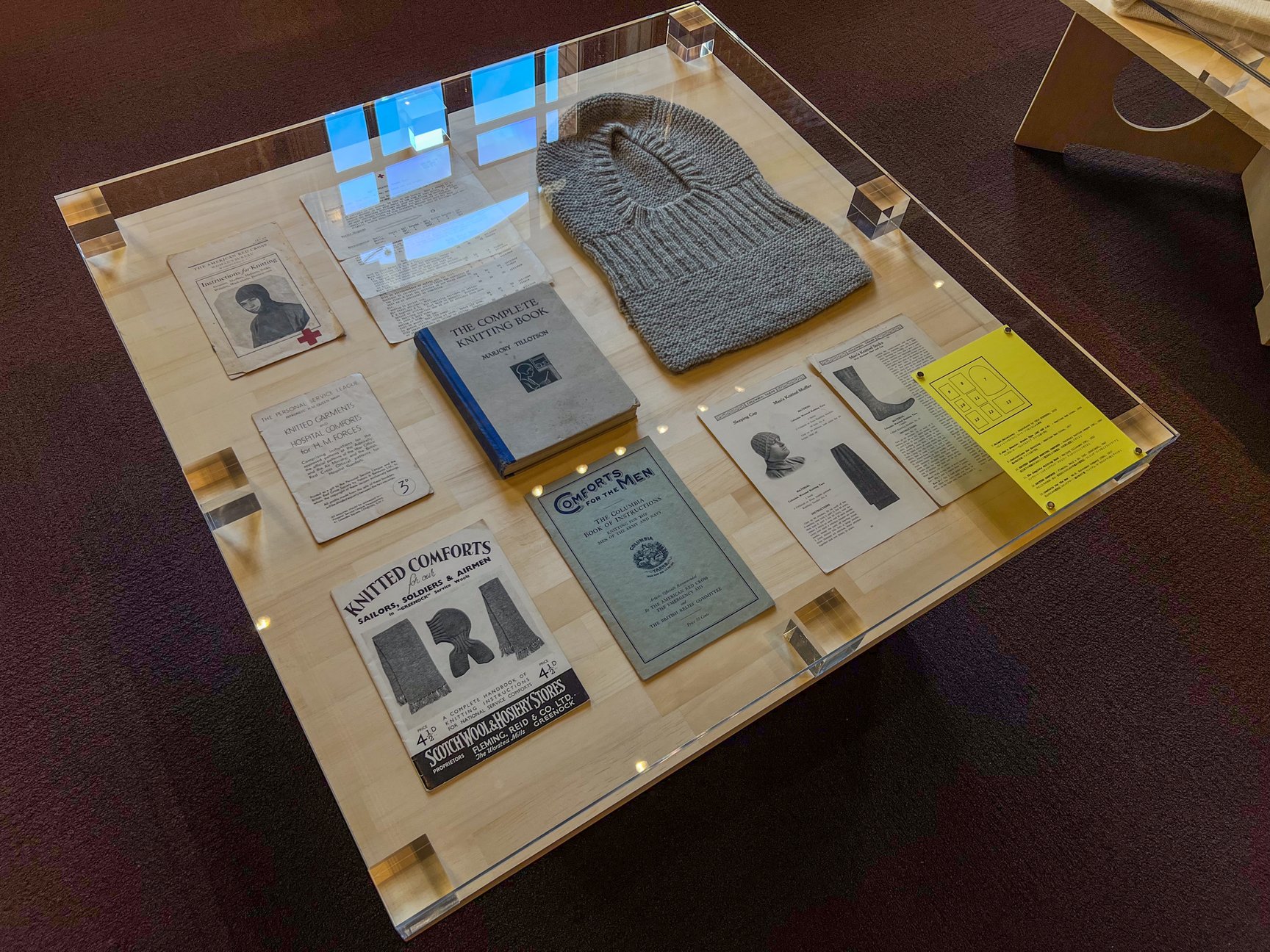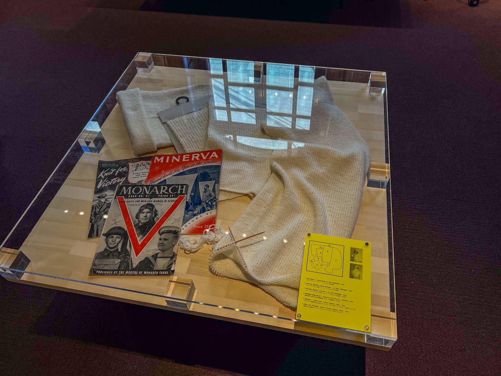 会場では、こうしたリサーチの過程で収集された1910年代以降の戦時下のアメリカ・イギリス・カナダで、一般市民が兵士や負傷者のために編んでいた衣服の図案を展示。それらは、現在の糸や道具で再現できるように再編集されている。