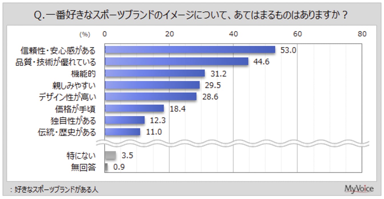好きなスポーツブランドがある人に、一番好きなブランドのイメージを聞いたところ(複数回答)、「信頼性・安心感がある」が53.0%、「品質・技術が優れている」が44.6%、「機能的」が31.2%となっています。
