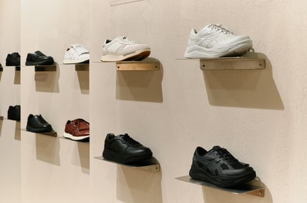 展示ブースでは「品格と機能美の追求」をコンセプトに、スポーツシューズの機能を搭載した最新のドレスシューズやスニーカーなどを展示した。メインアイテムとなる「ランウォーク セブン エルエス(RUNWALK 7 LS)」は、アシックスのランニングシューズのテクノロジーを応用したドレスシューズ。ソールのかかと部に衝撃緩衝機能「GEL」とスポンジを融合させた「fuze GEL」を内蔵し、中足部から前部にはY字型の樹脂製補強材を配置することで、歩行時のねじれ抑制と安定性を実現した。アッパーにはキップレザー、裏材にはキャメルカラーのステアレザーを採用し、手間をかけた仕上げによりクラシックな革靴の気品を持たせている 。このほか、ランニングシューズ由来の「ガイドソール」構造を採用し、歩行時のエネルギーロスを抑える「ペダラ ライドウォーク ツー(PEDALA RIDEWALK 2)」や、同構造にゴアテックスファブリクスやグリップ性に優れた「ASICSGRIP」を搭載した「ウエルネスウォーカー ゲルライドウォーク ジーティーエックス ツー(WELLNESS WALKER GEL-RIDEWALK GTX 2)」などを展示した。