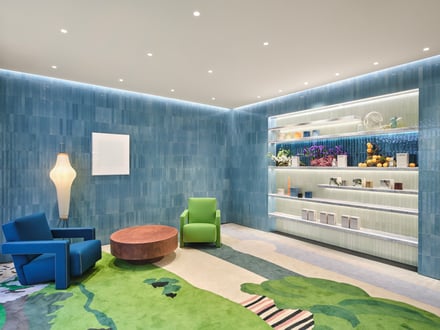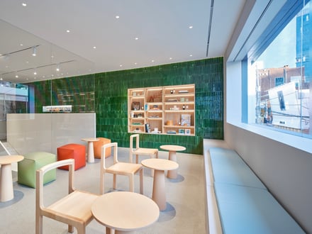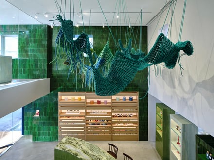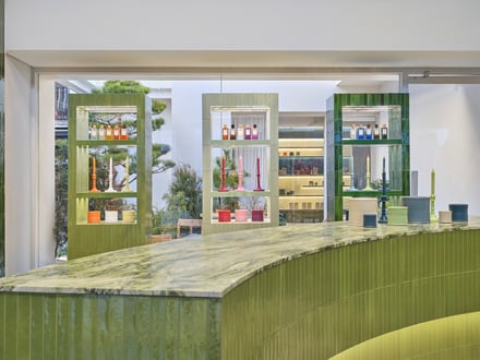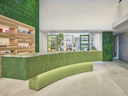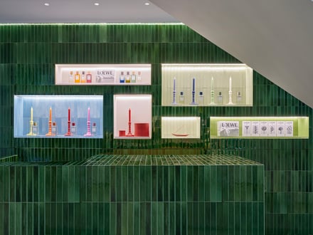 また、ファサードと店内には職人の手で仕上げられたセラミックタイルを使用。ティール・ブルーやエメラルド、ライムグリーン、ターコイズといった、色とりどりのタイルは、釉薬の不規則な表情とわずかな窪みを特徴とし、光を受けてさまざまな色彩へと変化するとした。