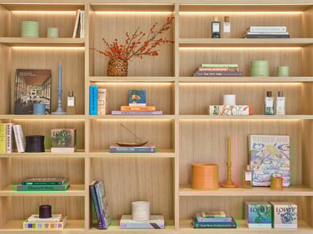 さらに今回、世界各地から集めたアートやクラフト、デザインの数々を2フロアにわたり展示。韓国人アーティスト カンホ・イ(Kwangho Lee)がこの店舗のために作成したニット製ペンダントや、韓国の陶芸家 ムン・ピョン(Mun Pyung)の月壺をはじめとした作品を随所に散りばめることで、アートコレクターの邸宅を想起させるような空間に仕上げた。