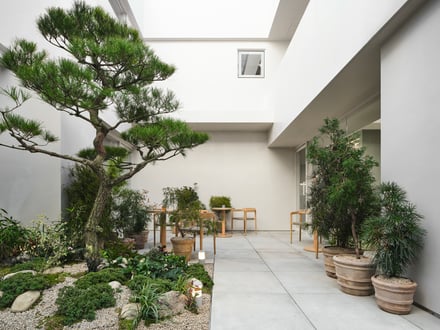 同店舗は、韓国の伝統的な家屋である韓屋(ハノク)に着想を得て、1階のすべての部屋から眺められる中庭を設置。中央の松の木を囲むようにスペインの陶器を並べることで、ロエベの原点でもあるスペインの感性と、韓国ならではのデザインを融合している。