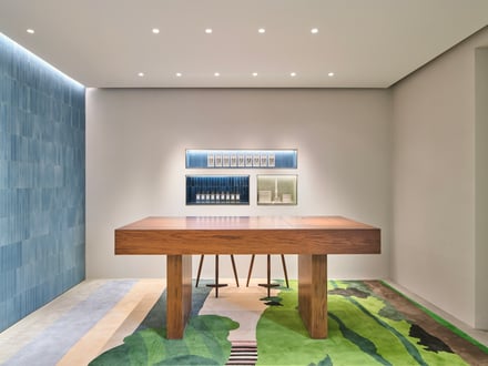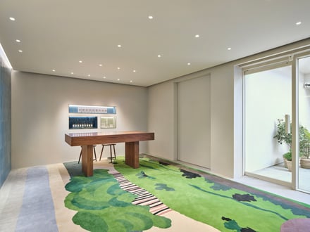 家具は、ジョージ・ナカシマ(George Nakashima)のチェアや、イサム・ノグチのフロアランプなど、温かみと色彩をもたらすものをセレクト。加えて、アトリエの余剰レザーをアップサイクルしたコーヒーテーブルや、英国のテキスタイルデザイナー ジョン・アレン(John Allen)によるタペストリー「Rowsley Clump」を再現した特注ラグなど、クラフトと素材感を引き立てるデザインも取り入れている。