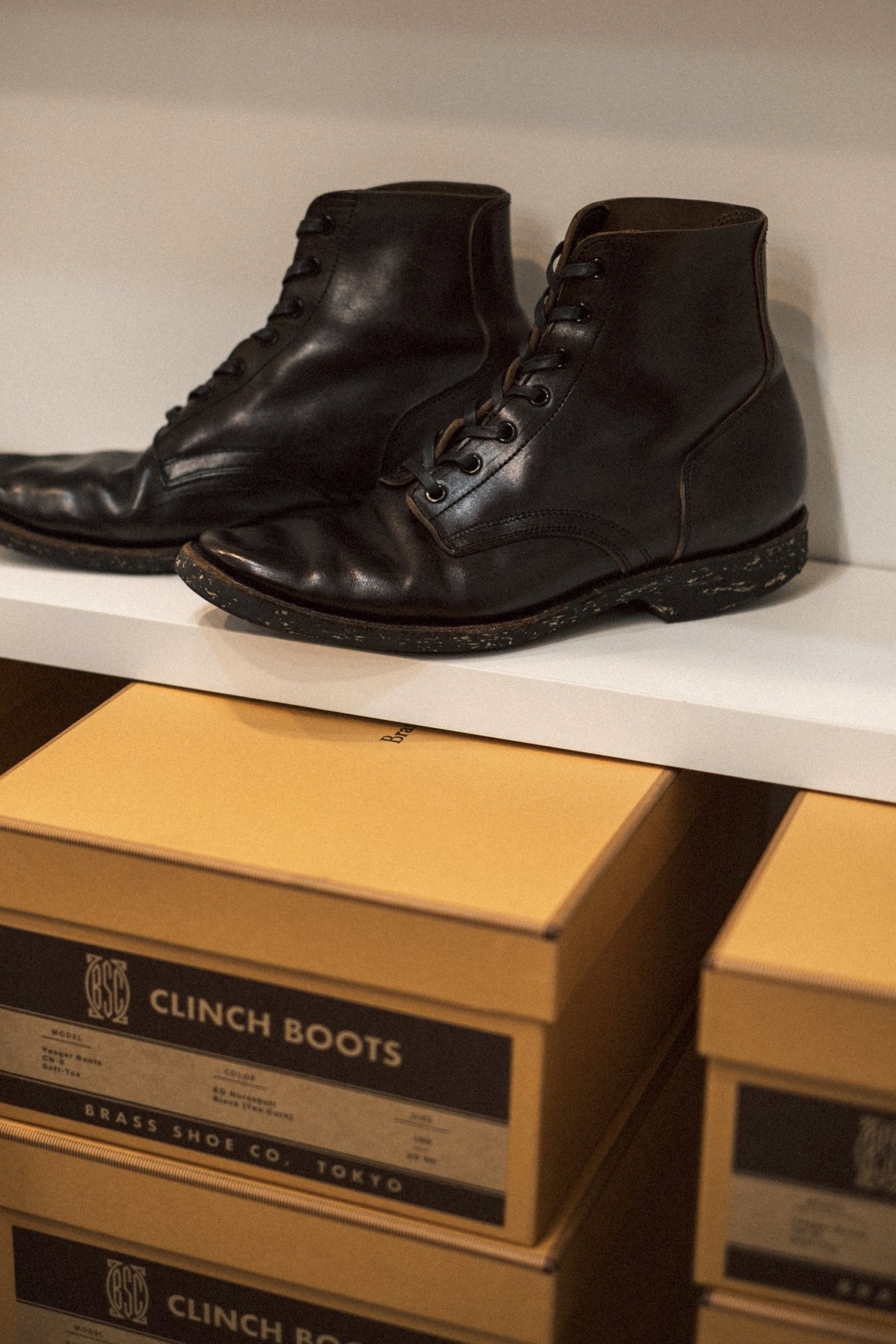 2012年には、シューリペア&カスタムの経験から得たノウハウを落とし込んだオリジナルシューズブランドとして、クリンチをスタート。松浦氏は「リペア事業と同じで、自分たちの手を通過したものが100年後も残り、その時代の職人たちのリペアを受け、さらにその先につながる靴が作りたかったんです」と立ち上げを振り返る。クリンチの製造は、機械では再現できない抑揚のある形状を生み、フィット感を叶えるハンドソーンウェルテッド製法を採用。そのほか手作業と機械を駆使した多くの工程を必要とする。非効率な方法であえて製造するのは、「美しさの理にかなった製法を遺したいから」だという。「現代の技術を否定するつもりは全くありません。効率重視の時代の流れで淘汰されてしまったけれど、履き心地や品質を担保してくれる製法は沢山あるんです。そうした技術を別軸の美学として、プロダクトとともに後世に残したいんです」と説明する。