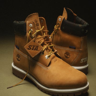 コラボシューズは、ティンバーランドの「Field Boot GTX」をベースに、アウトドアパフォーマンスを高めて設計。シューズの内部に独自の防⽔メンブレン「TimberDry」を備え、ソールには「Vibram」ソール、パッド⼊りカラー、ファイバーグラスシャンク、「PrimaLoft®」断熱材を搭載したほか、歩⾏時の衝撃を吸収してエネルギーに変換する「アンチファティーグテクノロジー」と「GORE-TEX®」も採用した。また、パネル構造のアッパーは、ブラックスエードと耐久性に優れたリップストップナイロンを組み合わせて製作。オリーブグリーンのDリングとアンディフィーテッドロゴプレートを配し、織り込み式のタンラベルをアクセントに加えた。価格は3万8500円。キャンペーンのモデルには、ラッパー兼プロデューサーのIDKを起用した。