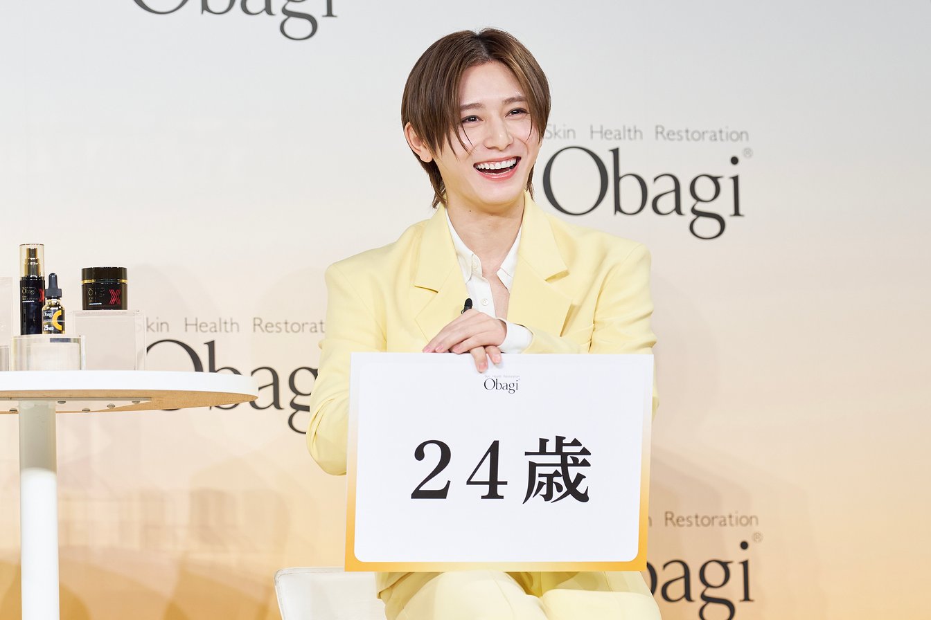 山田は、ブランドをイメージした“オバジカラー”のイエローのセットアップで登場。就任について「この機会を与えていただいたから使い始めたのではなく、普段から実際に使っていたものなので嬉しい。今の僕があるのは、オバジのおかげだなと思います」と、長年担当してくれているヘアメイクアップアーティストに勧められたことをきっかけに、長く愛用しているという。