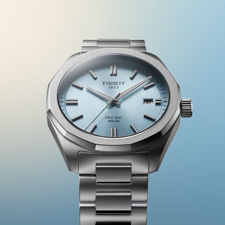 PRC 100 ソーラーコレクションは、2000年代初頭に誕生した「精密」「堅牢」「クラシック」がテーマのPRC 100 コレクションをベースに、ソーラーテクノロジーを搭載したモデルとして2025年に発表。12角形のベゼルが生み出すシャープな存在感に、光を美しく反射するサンレイ仕上げの高級感のある多彩な色合いのダイヤルが特徴。サファイアクリスタルの直下に配置されたソーラーセルが自然光だけでなく人工光からもエネルギーを得て蓄電する。消費電力を最適化した高精度なソーラー クォーツムーブメントにより完全な暗闇の中でも最長14ヶ月動き続け、スーパールミノヴァ®コーティングが施された針とインデックスは日没後も視認性を確保する。