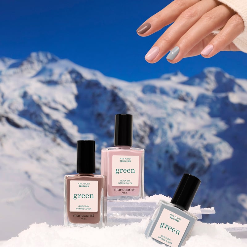 新作は、雪景色の余韻とやわらかなあたたかさを、穏やかかつ洗練されたカラーで表現。ネイルポリッシュ「グリーンナチュラルネイルカラー」(15mL 2970円)とジェルポリッシュ「グリーンフラッシュネイルラッカー」(15mL 3960円)の2製品を、「ミルキーピンク」「ミストグレイ」「フレックルズ」の3色で展開する。