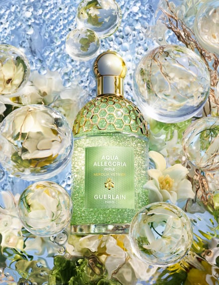 「ゲラン(GUERLAIN)」が3月1日、庭園の情景を描いたフレグランスシリーズから、パフュームパール フレグランス「アクア アレゴリア ペルレ」(限定、全3種、各125mL 各2万4310円)を発売する。