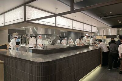 「個室会席・北大路・赤坂茶寮」のライブ感あふれるオープンキッチンは102平方メートルの広さ