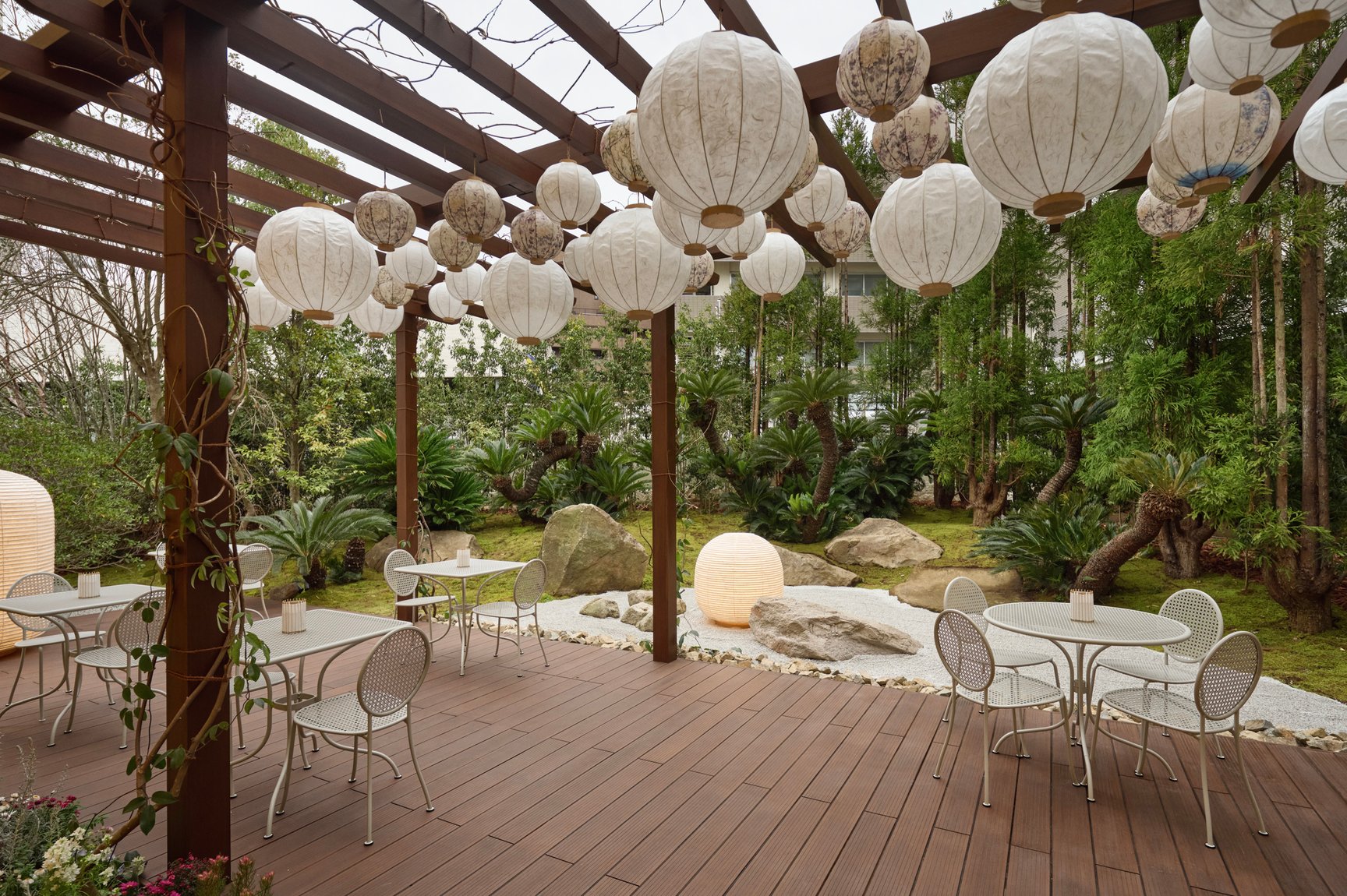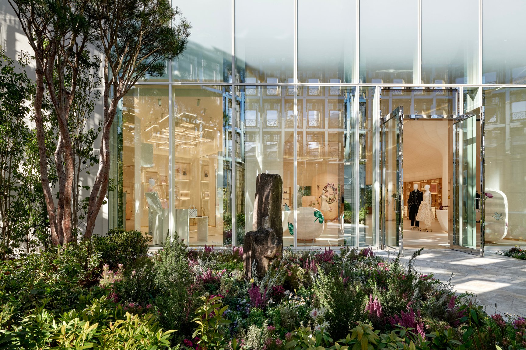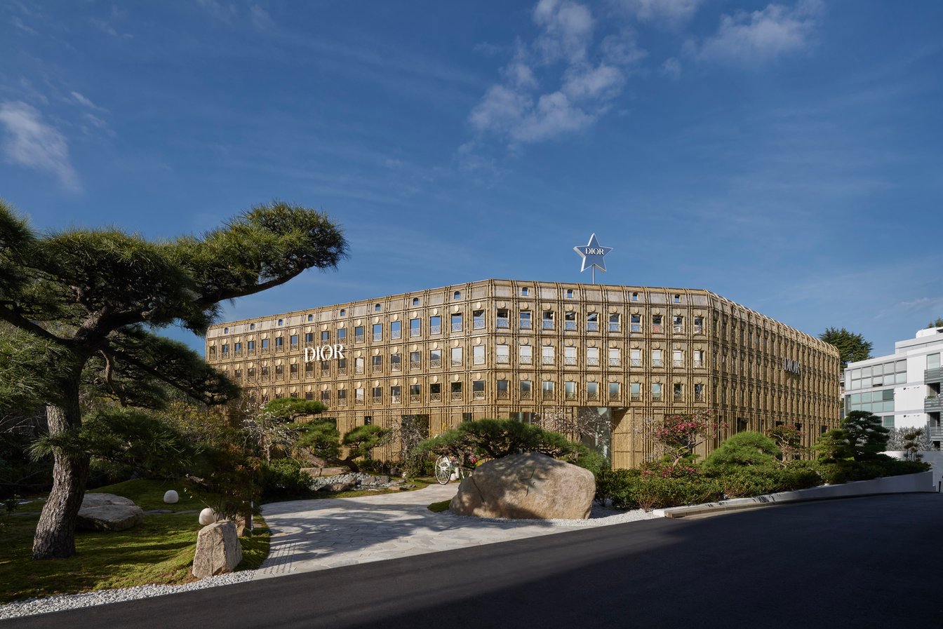 ディオール バンブー パビリオンは、猿楽町8丁目の八幡通りの裏手に位置し、パリの本店「30モンテーニュ」のファサードをゴールドのバンブーで再解釈した建築と、創設者クリスチャン・ディオール(Christian Dior)のラッキーチャームである星が目印。1800平方メートルの敷地には、プラントハンター西畠清順による「禅」をコンセプトにした庭園が広がっている。