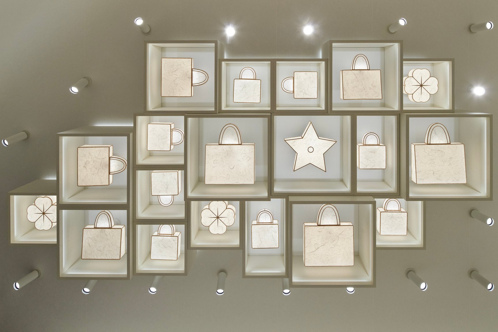 フィッティングルームは、アーティスト光井花が、いぐさと刺繍で「トワル ド ジュイ」を表現。ストア内には、TAKT PROJECTによる樹脂で「カナージュ」を閉じ込めたファニチャー、リサイクル素材を用いて制作したwe+のデイベッドや花瓶、太田翔による木製のテーブルとチェア、そしてCHIKAKENの「竹あかり」などが点在する。