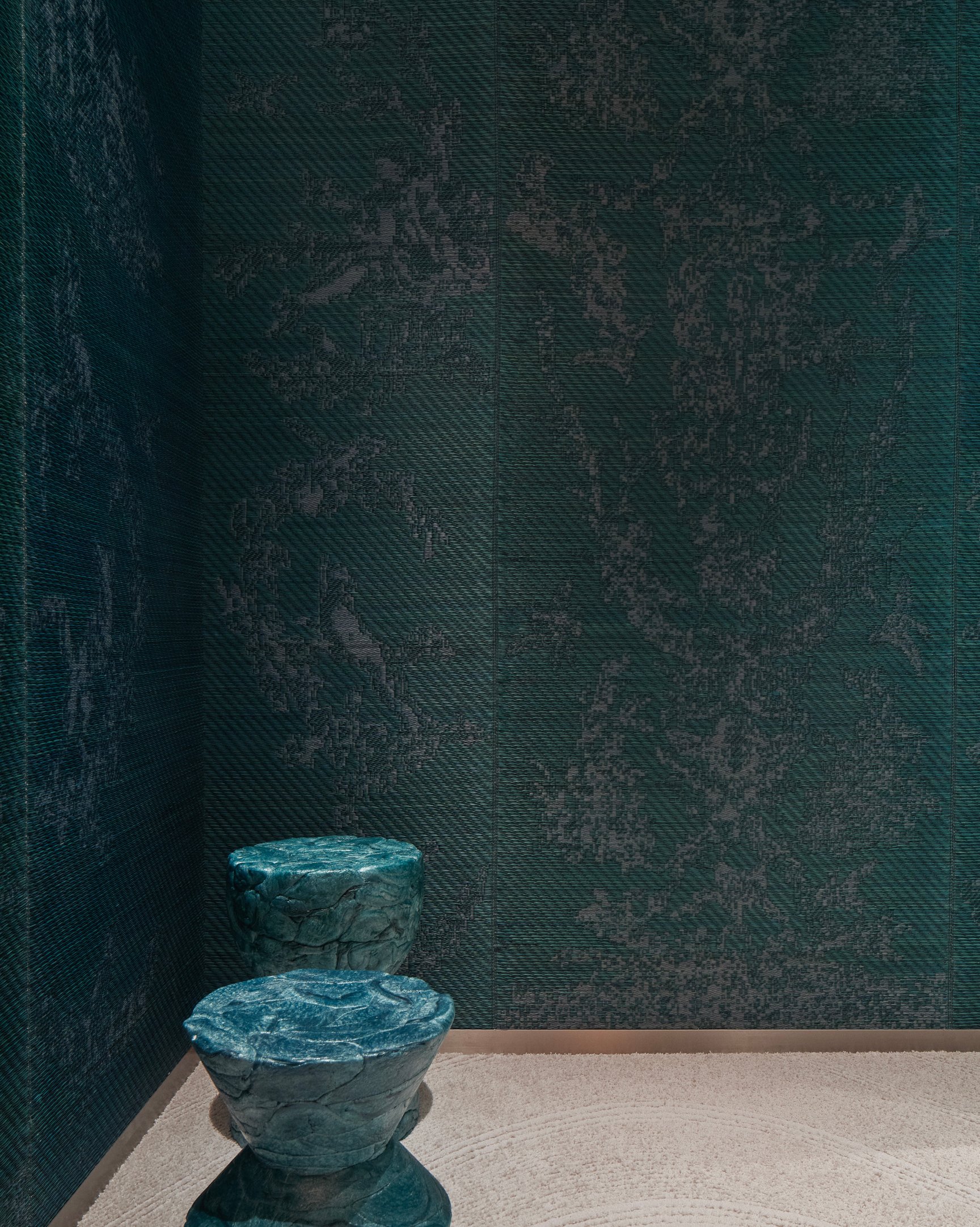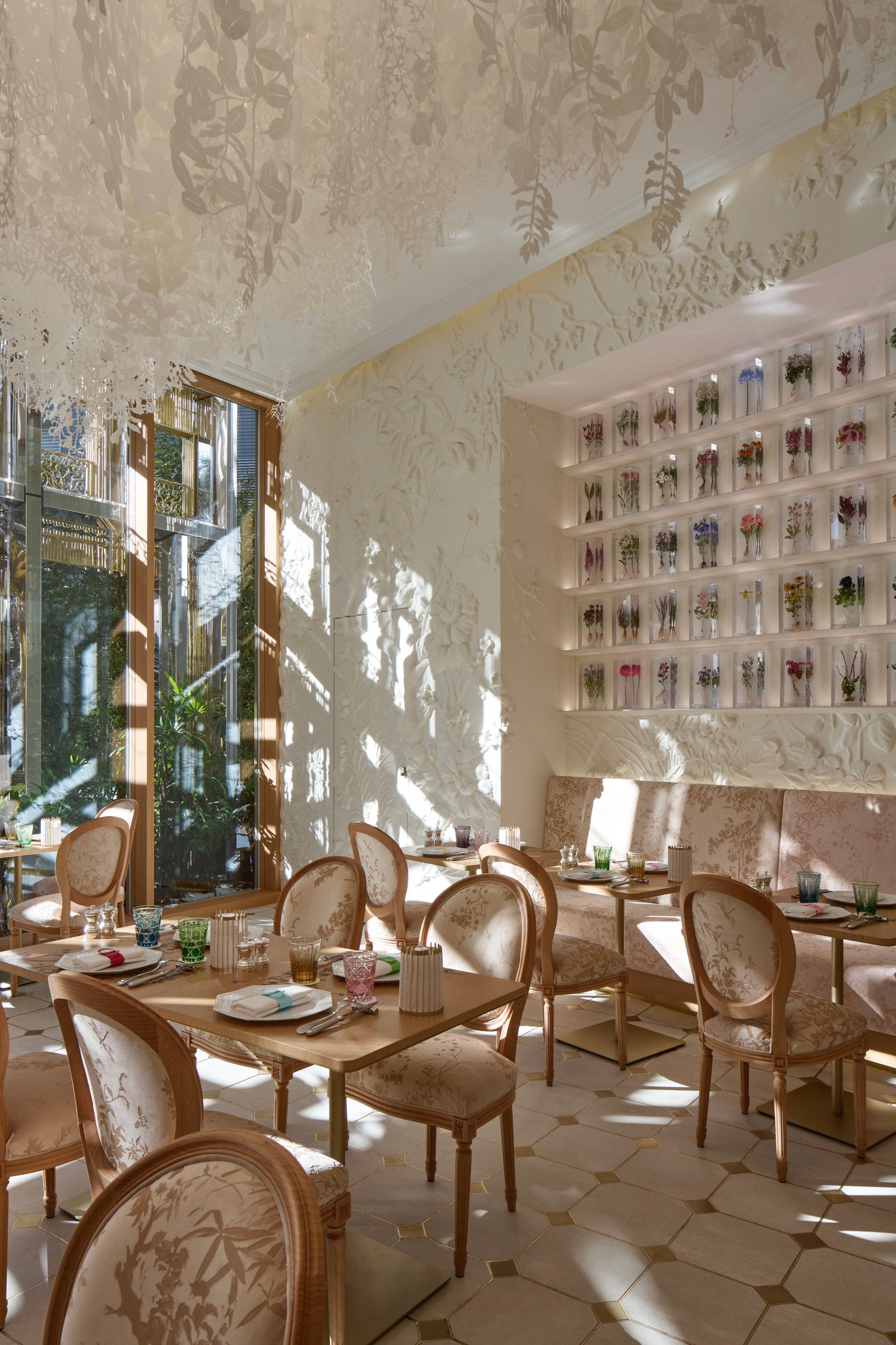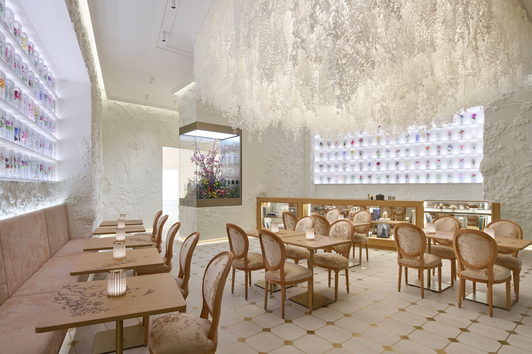 「カフェ ディオール」は、東信による作品「パルダリウム」と「ブロックフラワー」が彩り、柴田あゆみの切り絵による紙の花々のインスタレーションが天井から降り注ぐ。また東信は、館内に設けられたインナーガーデンも手掛け、クリスチャン・ディオールが幼少期を過ごしたグランヴィルの庭園を再解釈した。