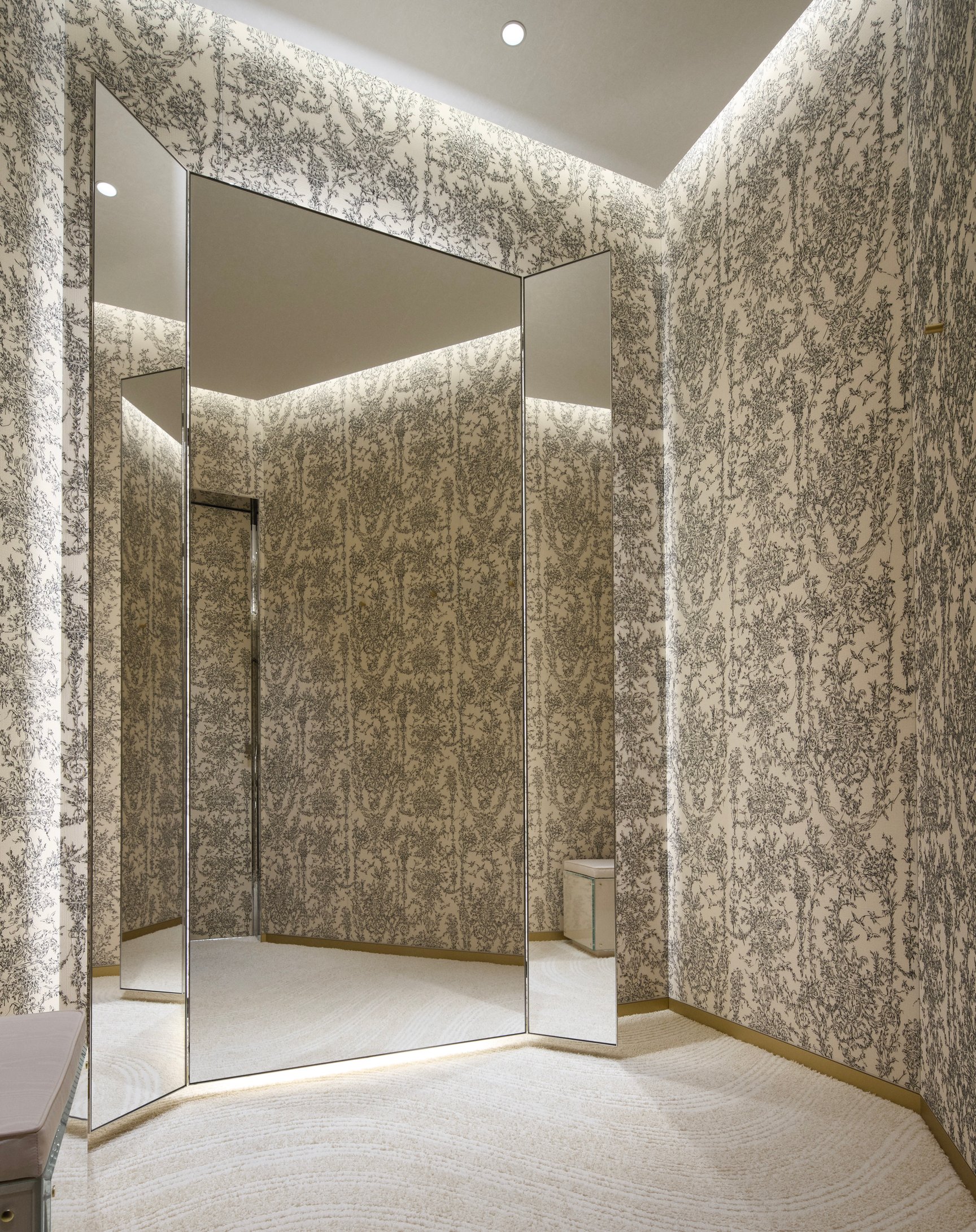 店内の中央フロアは和紙の壁に囲まれ、オープン時には京都の老舗 小嶋商店の提灯を配置。各部屋はそれぞれテーマが異なり、ヴェルサイユ様式の寄木細工のフローリングや、山形緞通のカーペット、モアレ模様の壁紙や畳の天井など、フランスと日本の伝統が融合している。