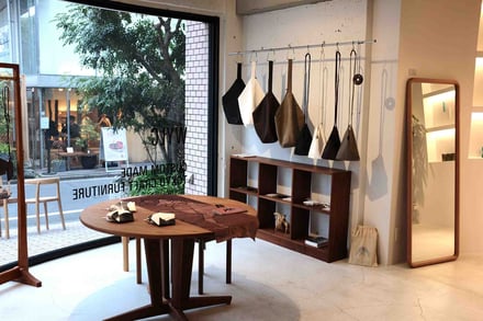 同ポップアップでは、「Place × Handwork」を掲げ、地域に根ざしたクラフトマンシップによって生まれたプロダクトを完成品としてではなく使い手の暮らしの中で育つものとして提案。会場では青森県産のレザーを使用したバッグ(5万5000円)や、五角形のウォレット(3万6300円)のほか、コラボアイテムとして、国産の漆で仕上げたレザーを用いたスツール(7万400円〜)とサイドテーブル(15万8400円〜)をラインナップしている。