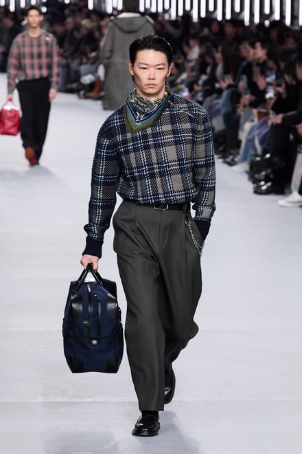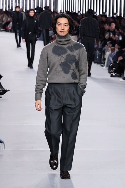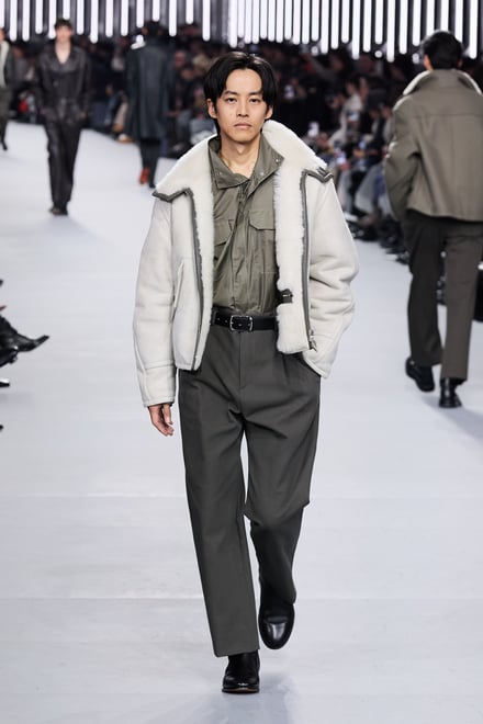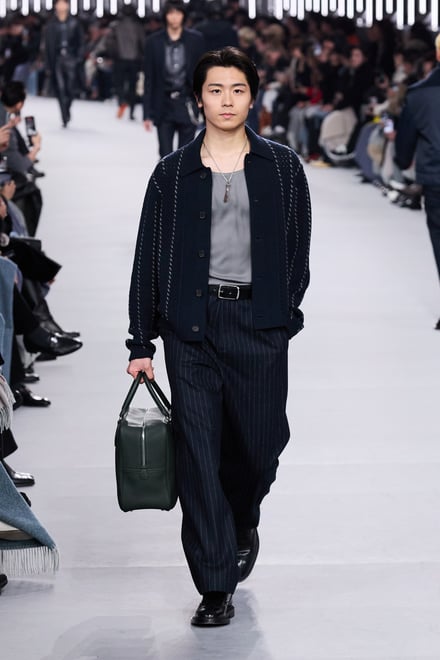 2026年秋冬メンズコレクションは、革新の中を歩み、探究し進化し続けるというエルメスの男性像を体現。メゾンが培ってきたヘリテージとともに、見えない部分や細部へのこだわりを随所に散りばめた。ラムスキンを編み込んだカシミヤニットや、ステッチでストライプを表現したカーフスキンのセットアップ、そしてシアリングを裏打ちしたテクニカル素材など、高度な技術を用いながら実用性を融合。全58ルックのうち、1991年秋冬コレクションのジャンプスーツなど、9型のアーカイヴデザインが現代の解釈で再登場した。ヴェロニクの集大成とも言えるが決して懐古的ではなく、「今と永遠のための服」というタイムレスなメンズコレクションとなった。
