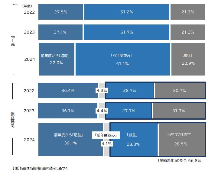 各社の業績動向をみると、売上高では物価高による節約志向の高まりが価格重視の消費傾向に現れたことから、「前年度並み」(57.1%)が最も多く、「増収」は22.0%となっています。損益面では、販売動向に応じたコスト管理を進め「増益」となった企業が39.1%と最も多く、前年度から3.0ポイント増加。「赤字」(28.5%)と「減益」(28.3%)を合計した「業績悪化」の割合は56.8%と前年度から2.6ポイント低下しました。