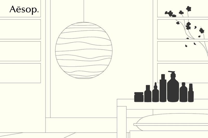 浴室はヘアケア、ボディケア、パーソナルケア商品を軸に構成し、入浴の美学を探求する姿勢を表現。日光浴室は陽射しを享受する空間とし、屏風を背景に彫刻家のイサム・ノグチが手掛けたペンダントランプを配した。台所や工房を想起させる空間にも、それぞれの物語性を感じさせるファニチャーやディスプレイを起用し、来場者を現在という時間軸に引き戻す構成とした。空間内に点在するイソップの商品は試用・購入でき、知性と感性を双方に訴えかける体験を提供する。