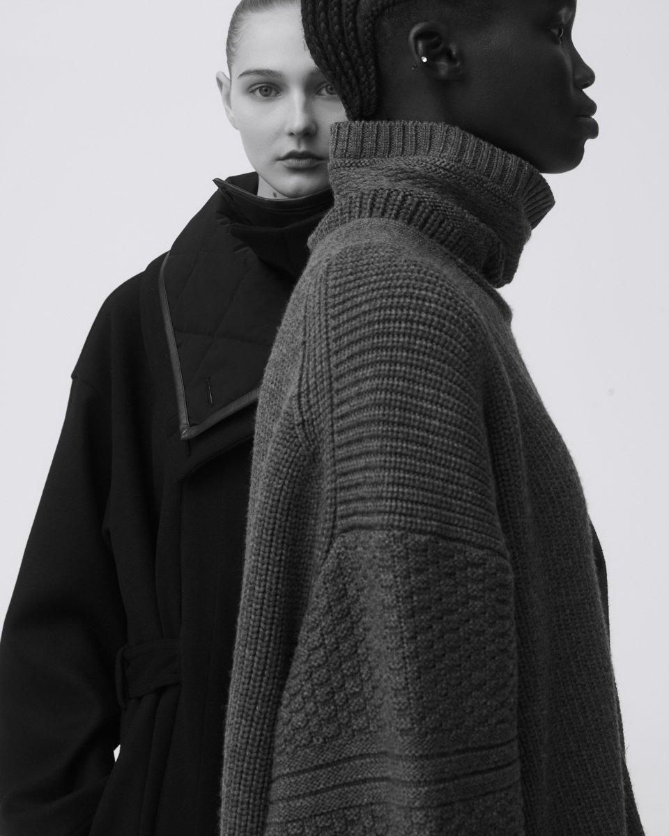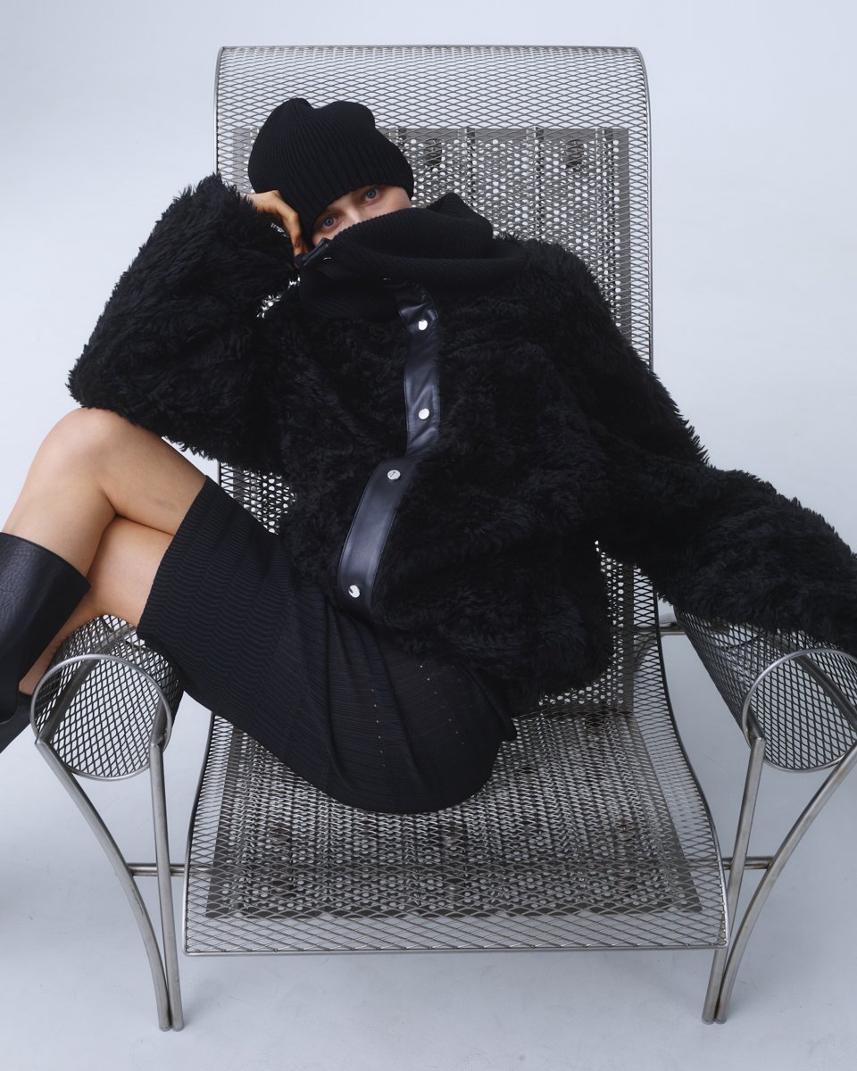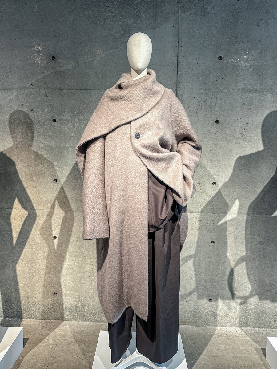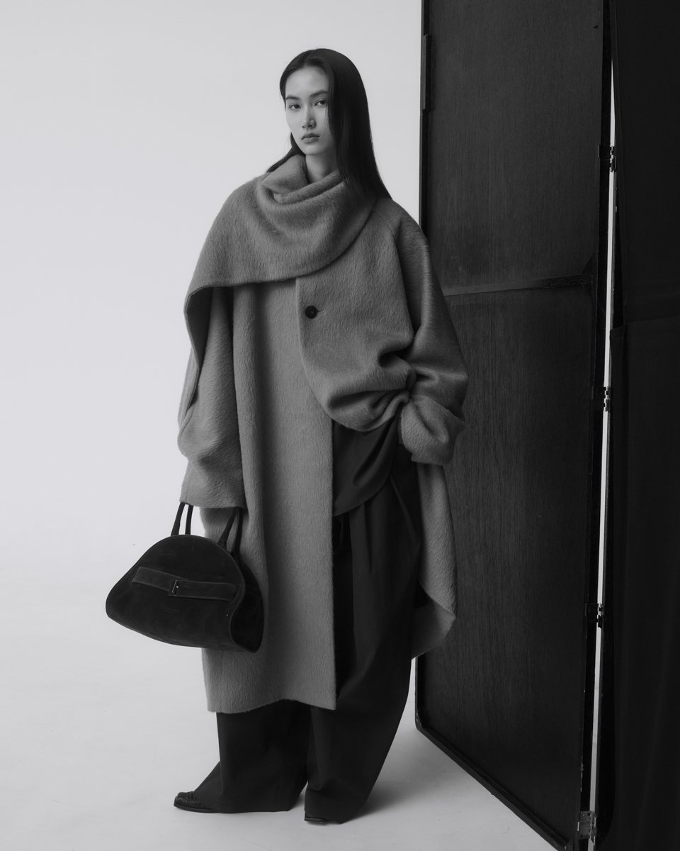 この硬質さの対比として、ペルー産原料を尾州で織り上げたスーリーアルパカ混シャギー素材を採用。普通のアルパカよりも毛が長く、高品質な保温性と軽量性を兼ね備える。しっとりとした光沢感で、削ぎ落とされたフォルムに柔らかな奥行きを演出。同素材を贅沢に使用したコートは、ケープ一型で無駄のないパターンワークによって、構築的なニュアンスと素材の柔らかさを同時に引き立てる。