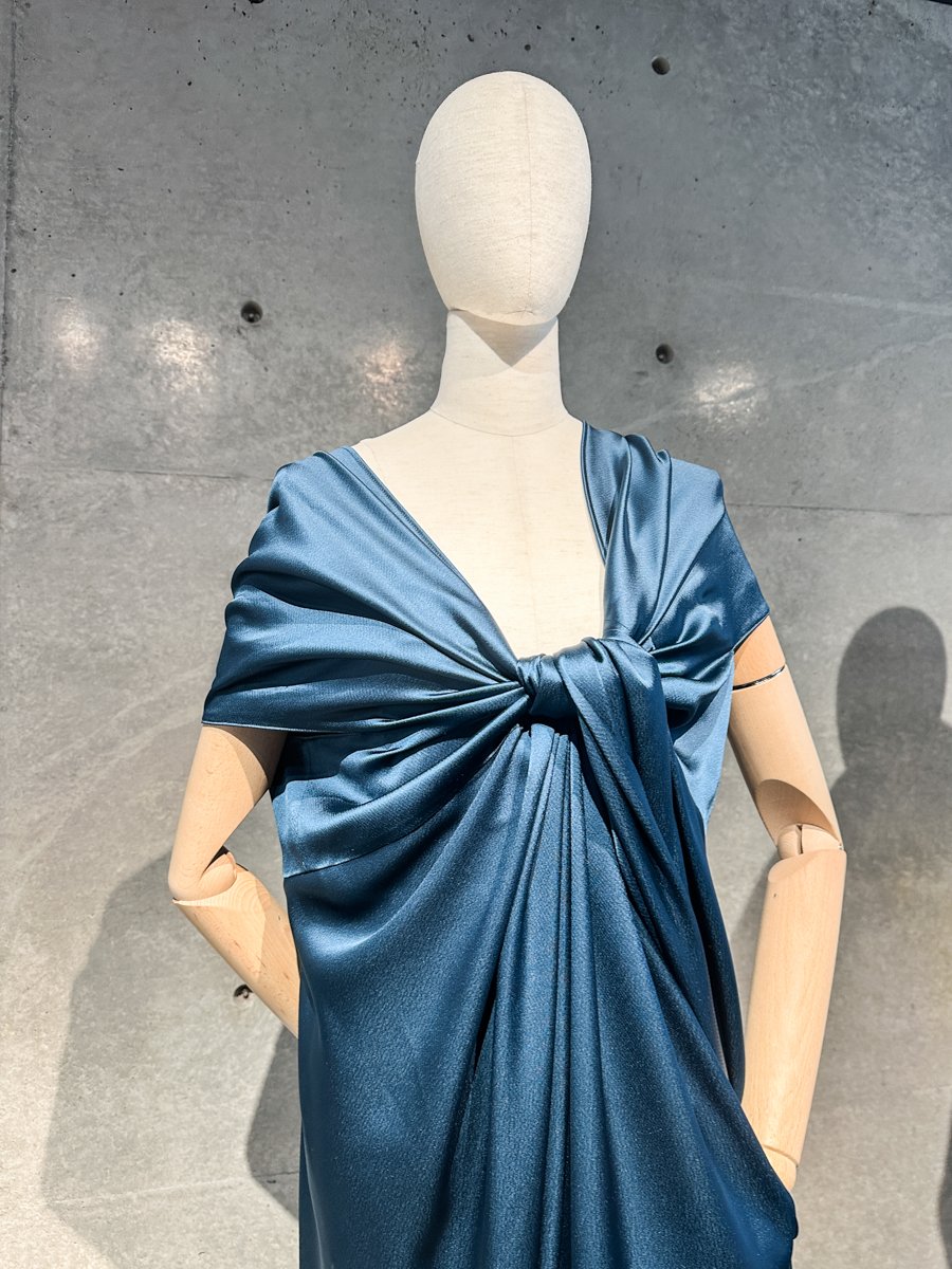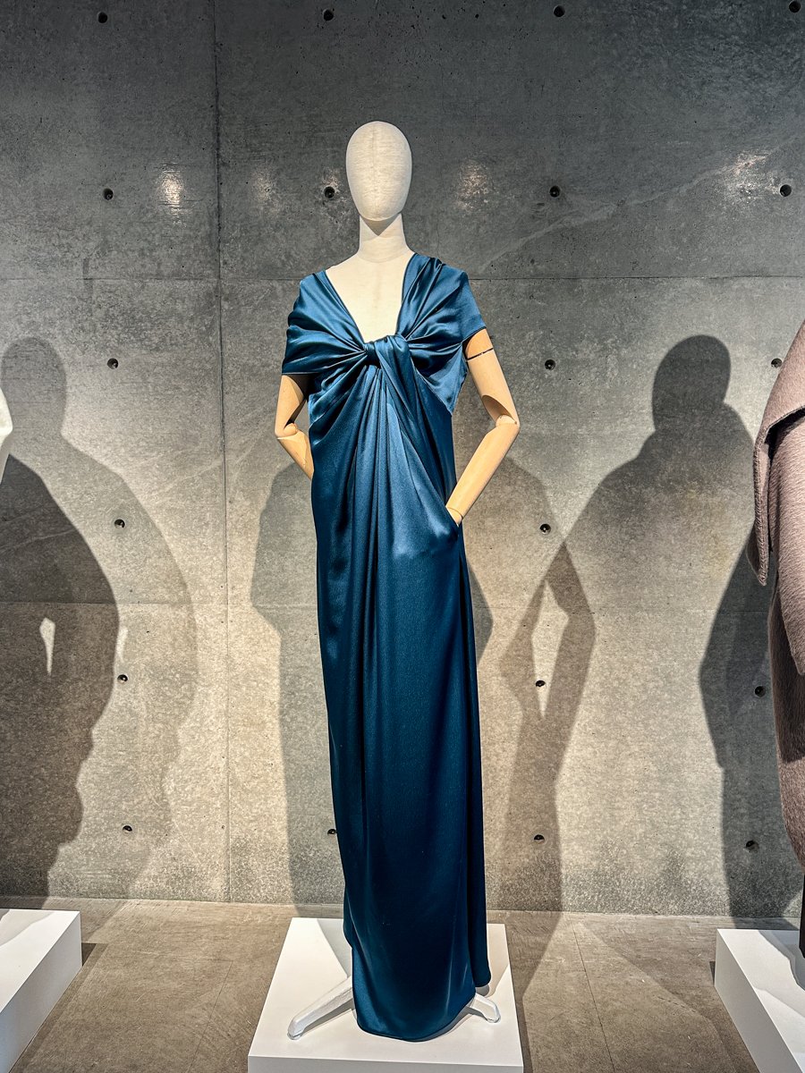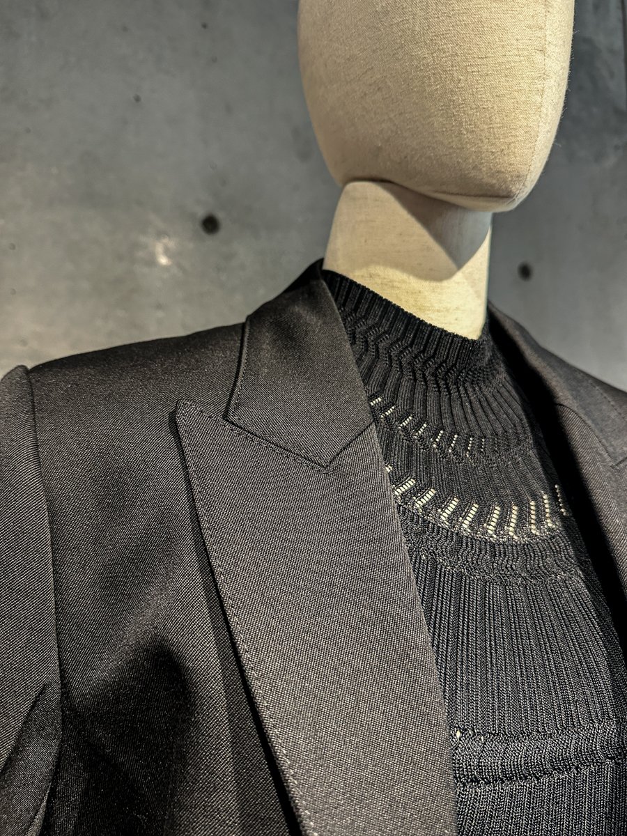 ジャージー素材のセットアップは、トップスの肩の落ち感やカーヴィーな袖、パンツの緻密なタックや腰回りのパターンでエレガントな雰囲気へと昇華。日常着の印象が強い素材も、単純なカジュアルダウンではなく、日常に寄り添うエレガンスとして機能していた。