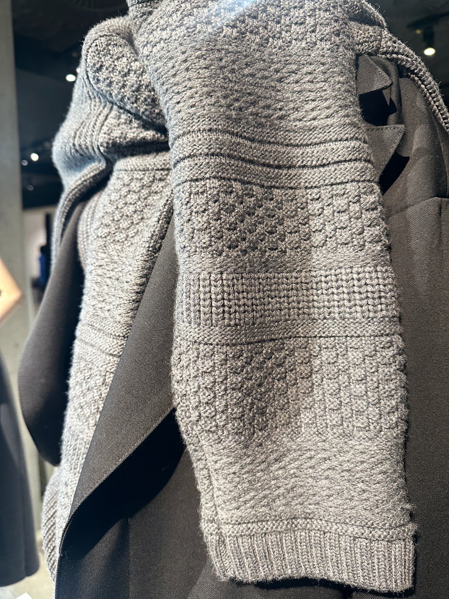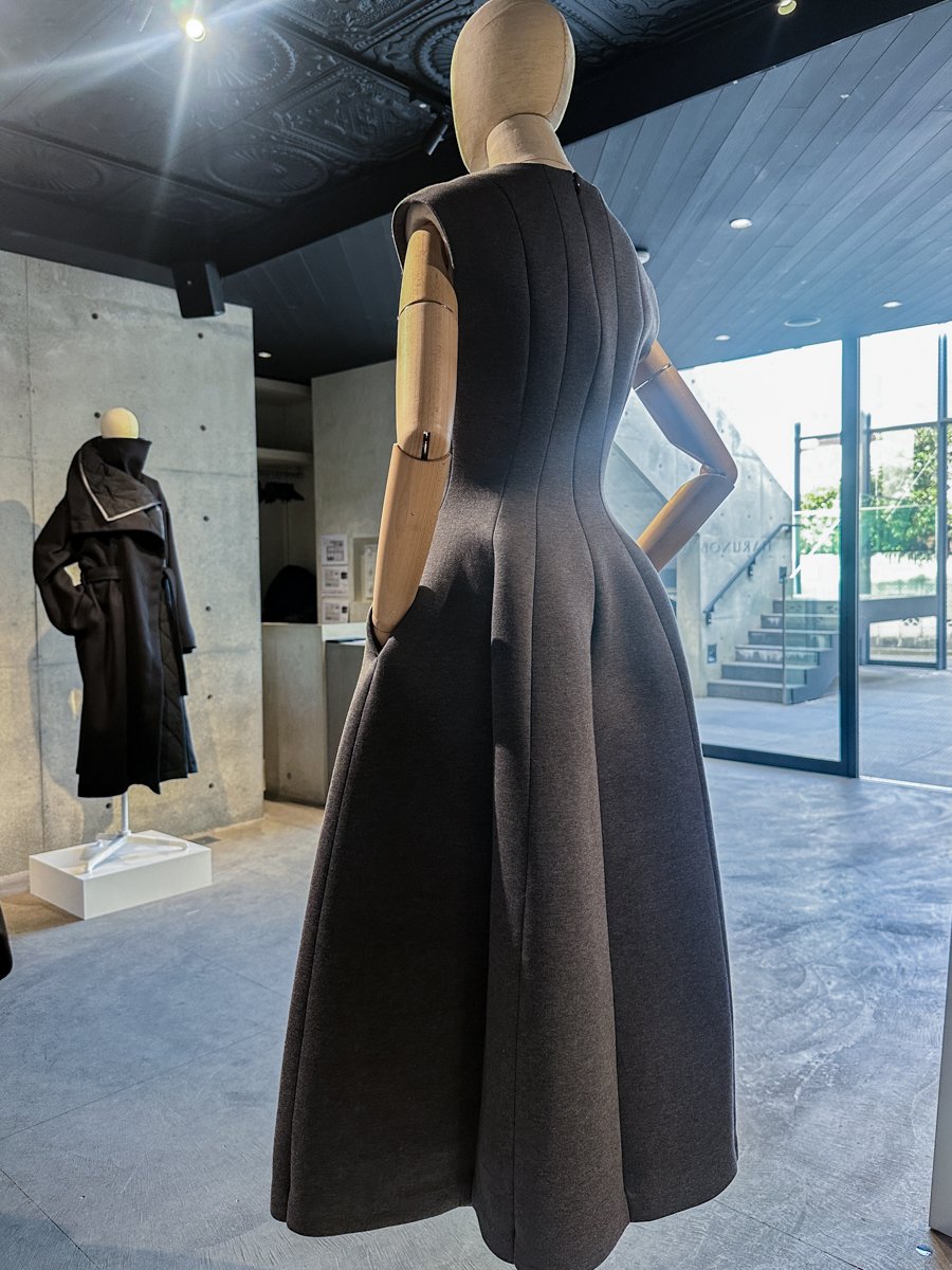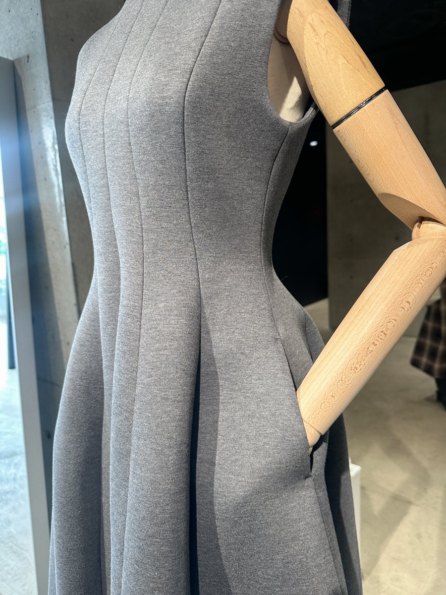 村田の真髄とも言えるミニマルなパターンワークは随所に見られ、ノーカラージャケットは胸元に横一本のシームを施し、建築的な印象を備えた。自然な伸縮で心地よく身体に沿うニットワンピースは、ウエストのリブを編み目の美しさを保ちながら縦・斜めに入れラインを整えている。一見ストレートなシルエットに見えるタイプのニットワンピースは編み地の変化を取り入れ、シャープでありながら多彩な表情を潜ませた。