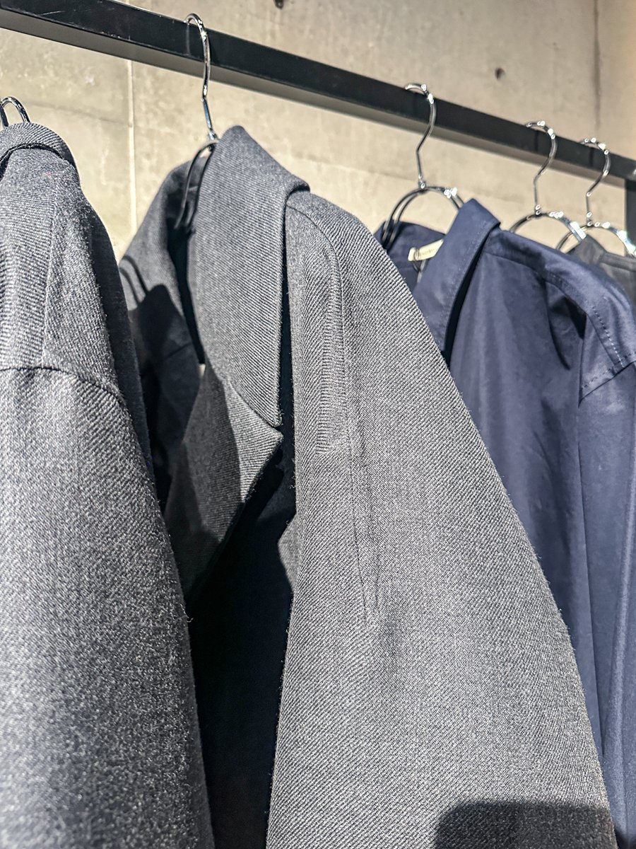 また、オーストラリア産の原料によルウールダブルフェイス素材は、二層構造特有の膨らみと反発を備える。この素材で仕立てたコートは取り外し可能なダブルレイヤーのビッグカラー付きで、優しい肌触りでありながら、ストイックな立ち姿を意識したという。村田は素材選びとパターンについて「物質的な緊張感を保ちながら体の動きを邪魔せず、自然となじむ。そんな素材とパターンワークを目指した」と説明する。