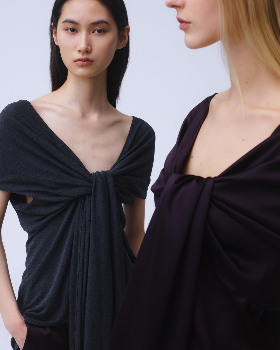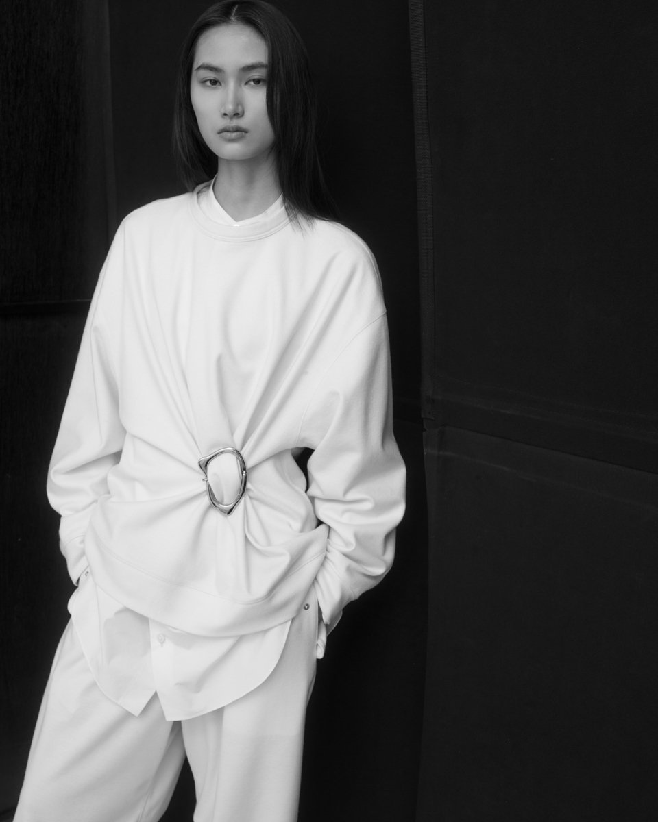 村田はこうしたルースの思想を出発点に、装飾性を削ぎ落とした最小限の要素で、現代の都市生活に溶け込むエレガンスを探求したという。「僕のデザインは元々ミニマリズムの系譜なのに、今まではダイナミズムやスペクタクルを意識する比重が大きかったように思う。自分が求めるラグジュアリーやエレガンスを見つめ直した時、シンプルな要素で服を作り上げることが、情報過多な社会のなかで、禁欲的になるのではなく、自然な思考・マインドプロセスで過剰なものから解放されていく。そんな現代の女性・男性に向け、ルースが奮闘したようにミニマルな佇まいを提案したいと思った」と語る。