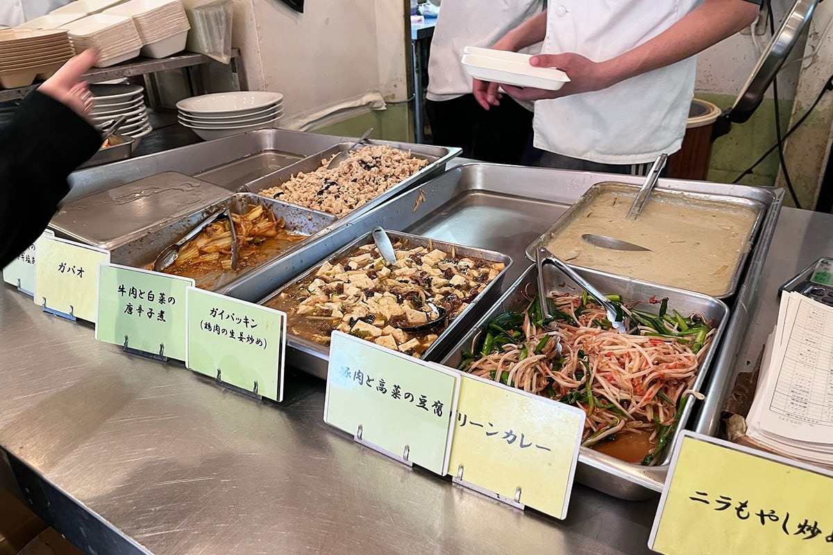 ガパオやグリーンカレー、そのほか含め6〜8種類くらいあるメニューの中から、3種を選んで、それを豪快にご飯の上にオン!これがめちゃくちゃおいしい。