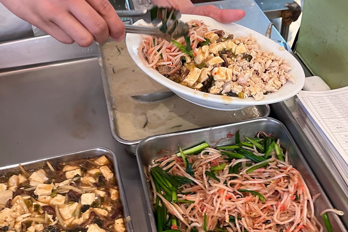 さらに見た目が麻婆豆腐っぽい「豚肉と高菜の豆腐」は、辛さはなく、甘味とコクが餡に絡んでこれまた美味。シャキシャキのニラもやし炒めはほんのりピンク色。これはたっぷりの小エビちゃんから旨みをもらっている証拠だ。