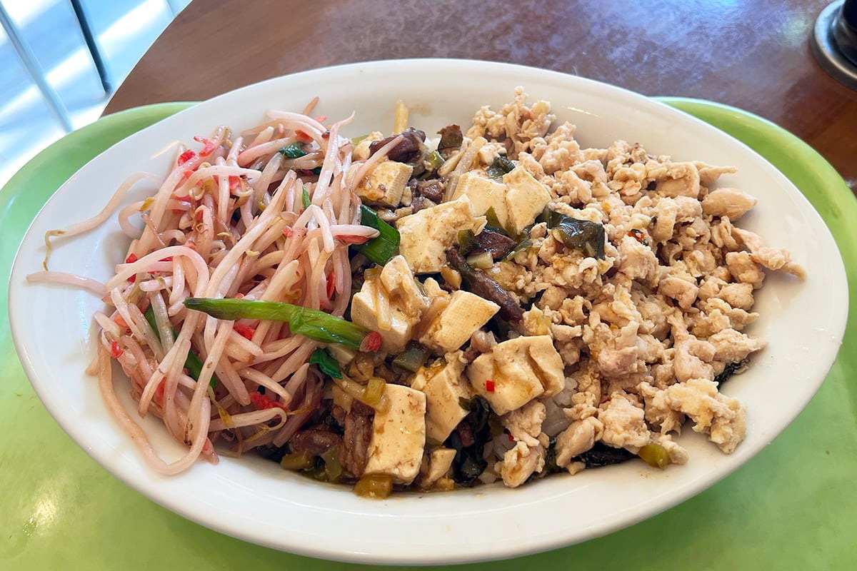 今回選んだのは、チャオバンブーと言えばな鉄板のガパオを軸に、豚肉と高菜の豆腐、そしてニラもやし炒め。あえてのグリーンカレー外し(おいしいよ)この3連単でいく!!間違いないでしょ。