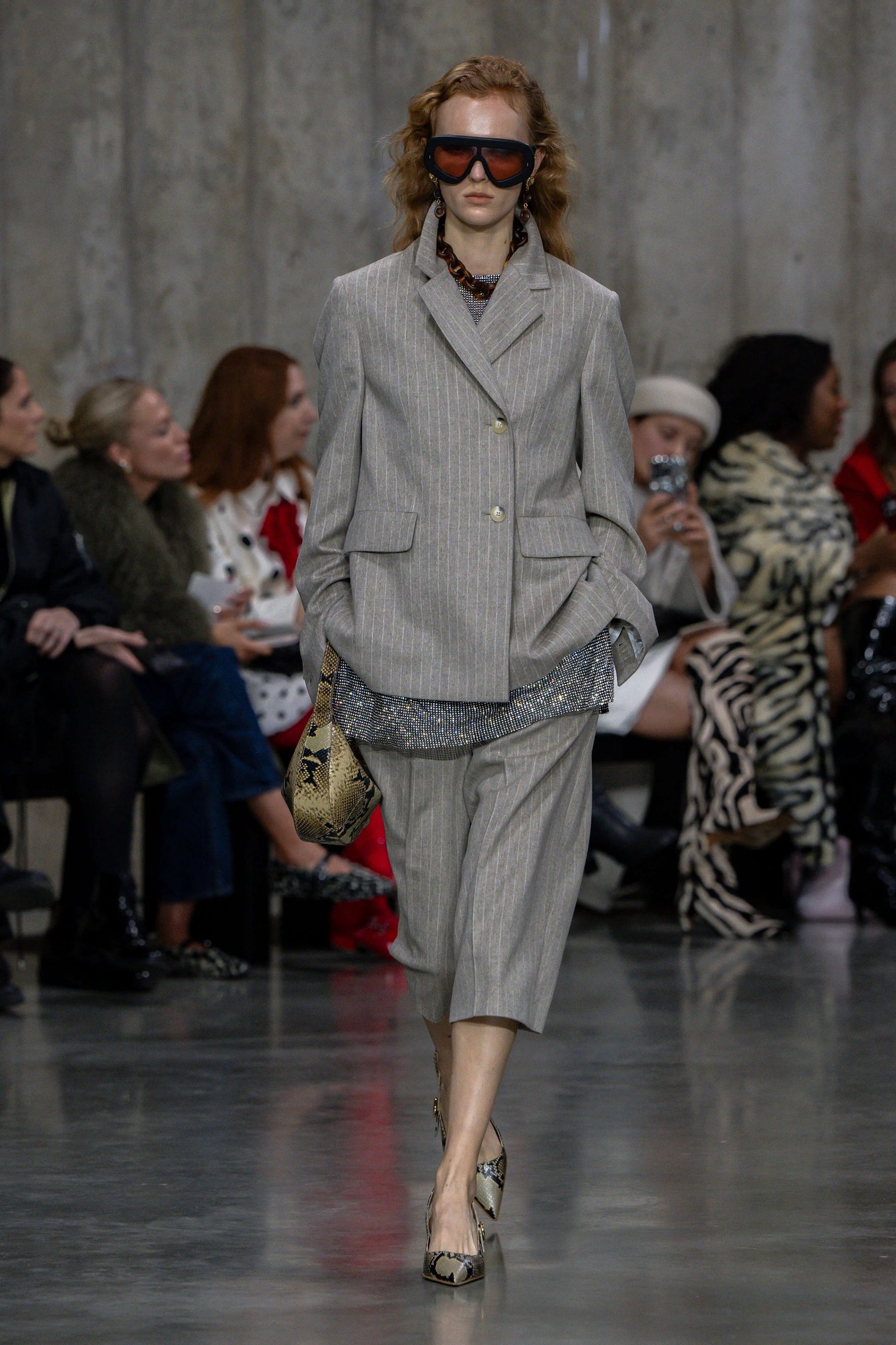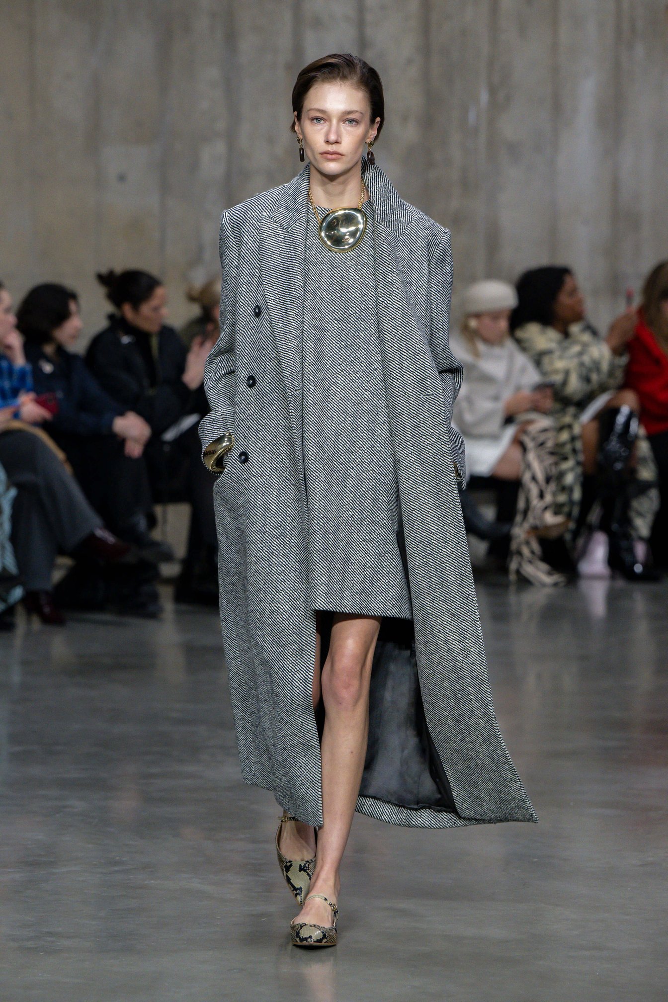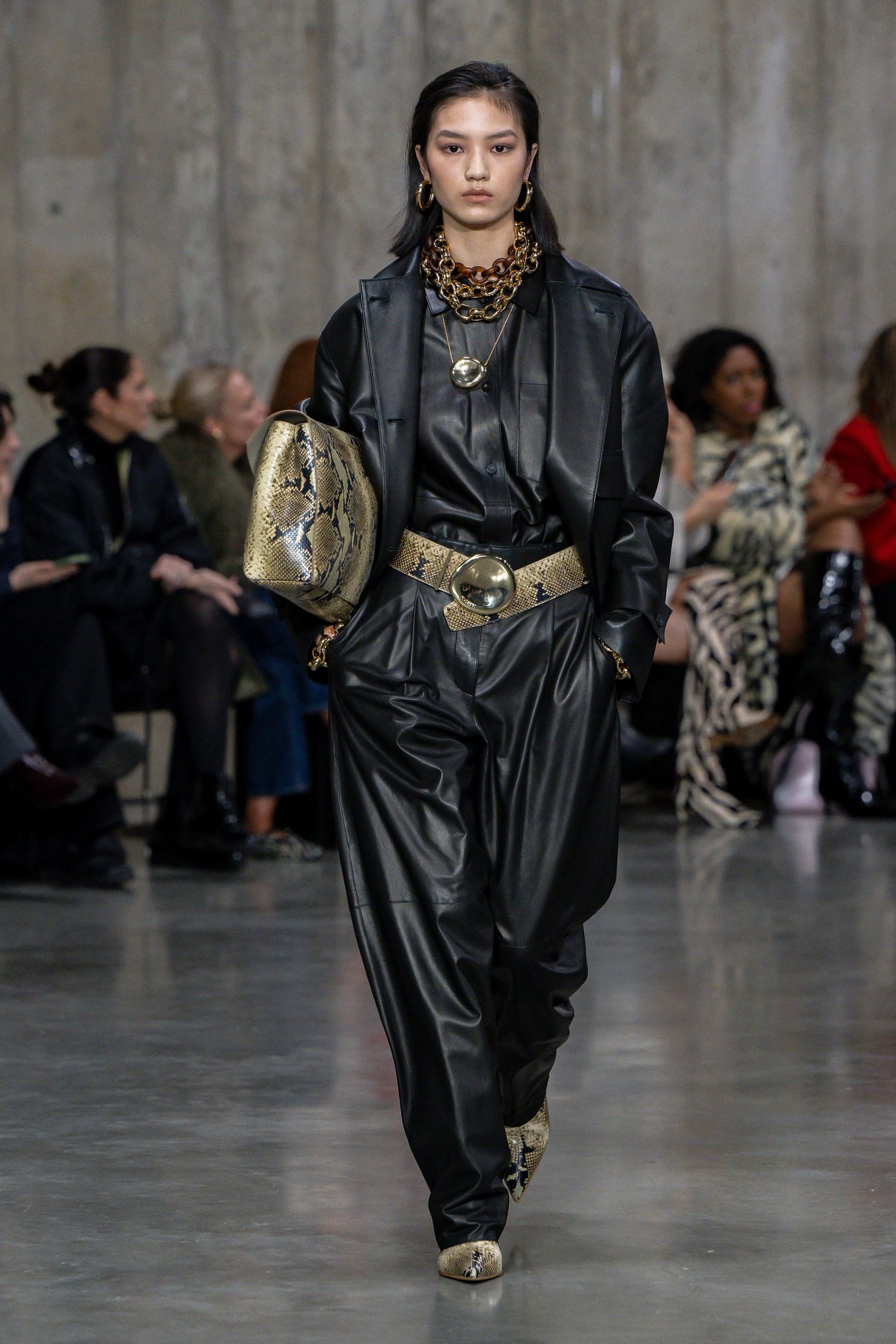 ブランドの核となるレザー、ニットウェア、アウターウェアを再解釈しつつ、コレクション全体はエフォートレスな着こなしを追求。また、パイソン柄やゴールドなど大胆でエキゾチックな要素を加え、力強さと洗練を兼ね備えたルックは、自立した現代女性を象徴している。