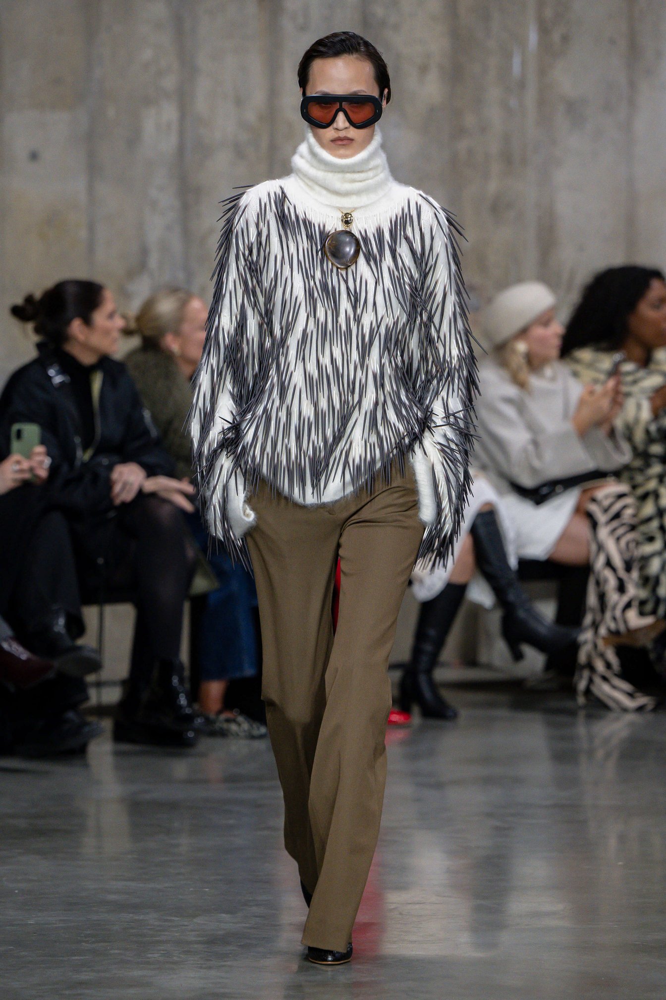 特に目を引いたトゲトゲとしたニットのルックは、3Dプリンターで制作したヤマアラシ(ポーキュパイン)風の針を一本一本手作業で縫い付けており、約12キロの重量があるという。マリオは「職人技と最新技術を融合させ、感覚的な体験を届けたかった」と語る。