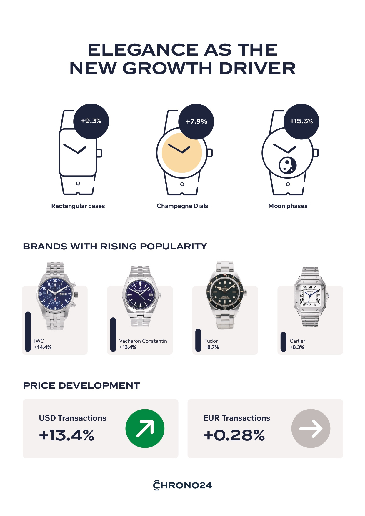 ・デザインシフト:ドレスウォッチがスポーツウォッチを凌駕。レクタンギュラー型ケースとシャンパンカラーの文字盤の需要が、それぞれ9.3%と7.9%アップ。