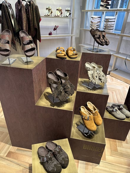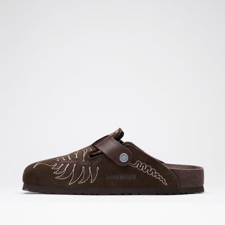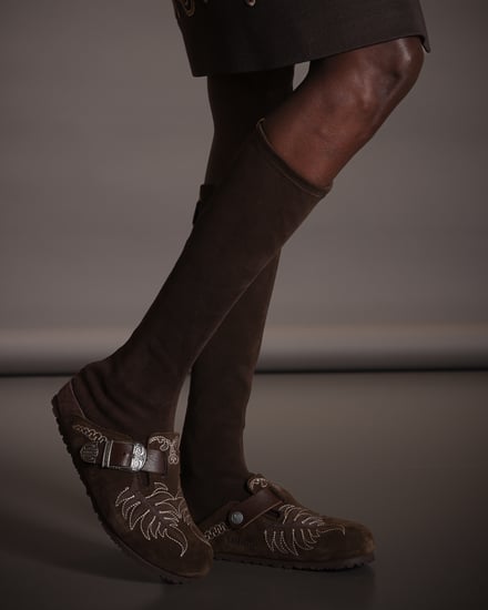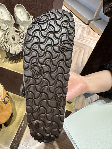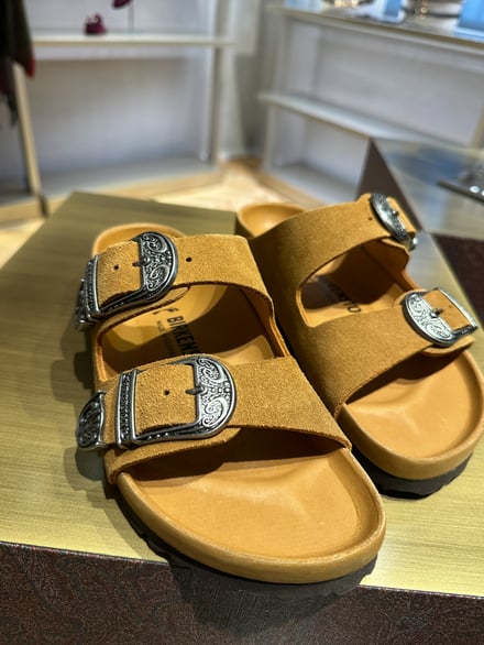 エトロのクリエイティブディレクターであるマルコ・デ・ヴィンチェンツォ(Marco De Vincenzo)は今季、「Loop Forward」をテーマとした。コラボではこのテーマを踏襲しながら、ペイズリーモチーフや金属装飾といったメゾンのコードを、ビルケンシュトックのアイコンアイテム「Boston」、「Arizona」、「Gize」に取り入れた。ソールはビルケンシュトックのクラシックなボーンパターンの中に、エトロのペイズリーを組み合わせている。ショーでは、各サンダルと同系色のハイソックスを合わせたスタイリングを提案した。