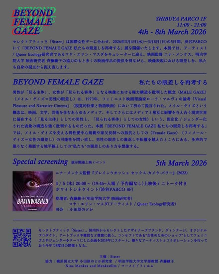 セレクトブティック「シスター(Sister)」が、3月8日の国際女性デーに合わせた展示「BEYOND FEMALE GAZE 私たちの眼差しを再考する」を渋谷PARCO 1階 ARCADEで開催する。期間は4日から8日まで。