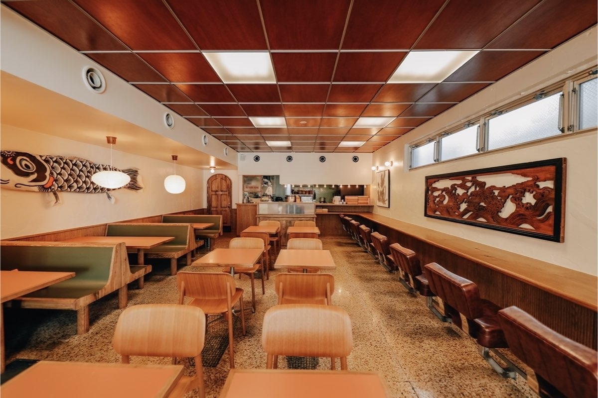 今回の移転を機に、席数が17席から45席へ拡大。日本とアメリカ、それぞれのミッドセンチュリーデザインが調和する空間には、江⼾時代にお寺に飾られていた欄間や和紙で制作された⼤きな鯉のぼりをディスプレイ。幕末三筆の貫名菘翁(海屋)による富⼠⼭の水墨画が描かれた掛け軸や書道家の中友香による書き下ろしの書も飾られる。