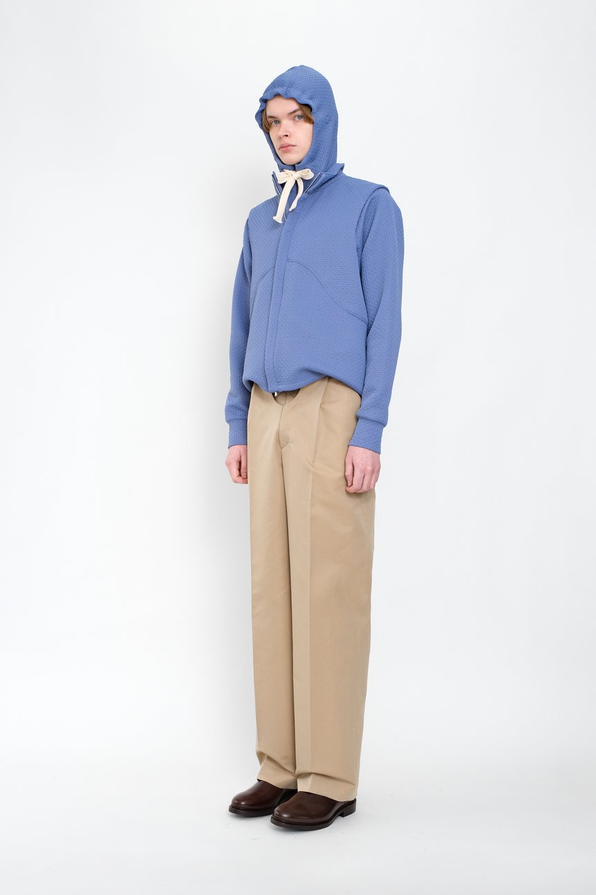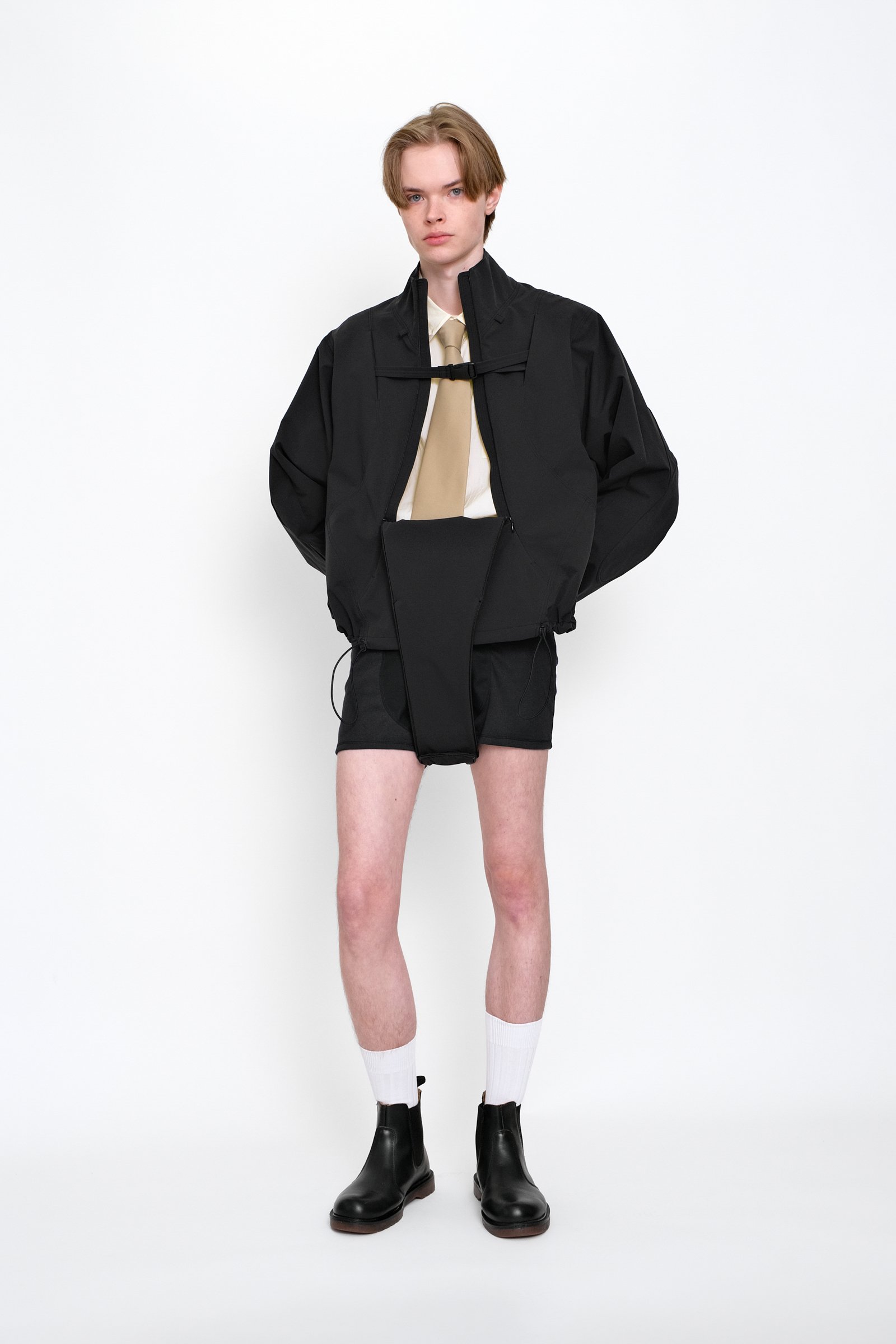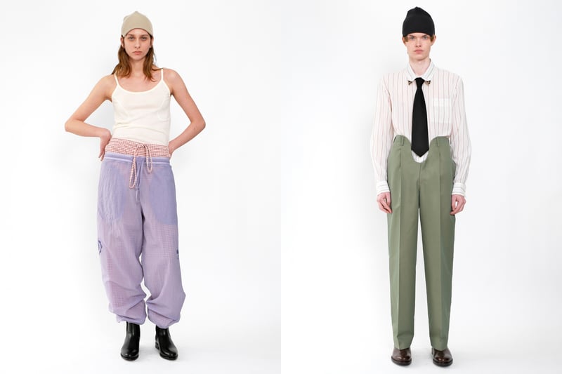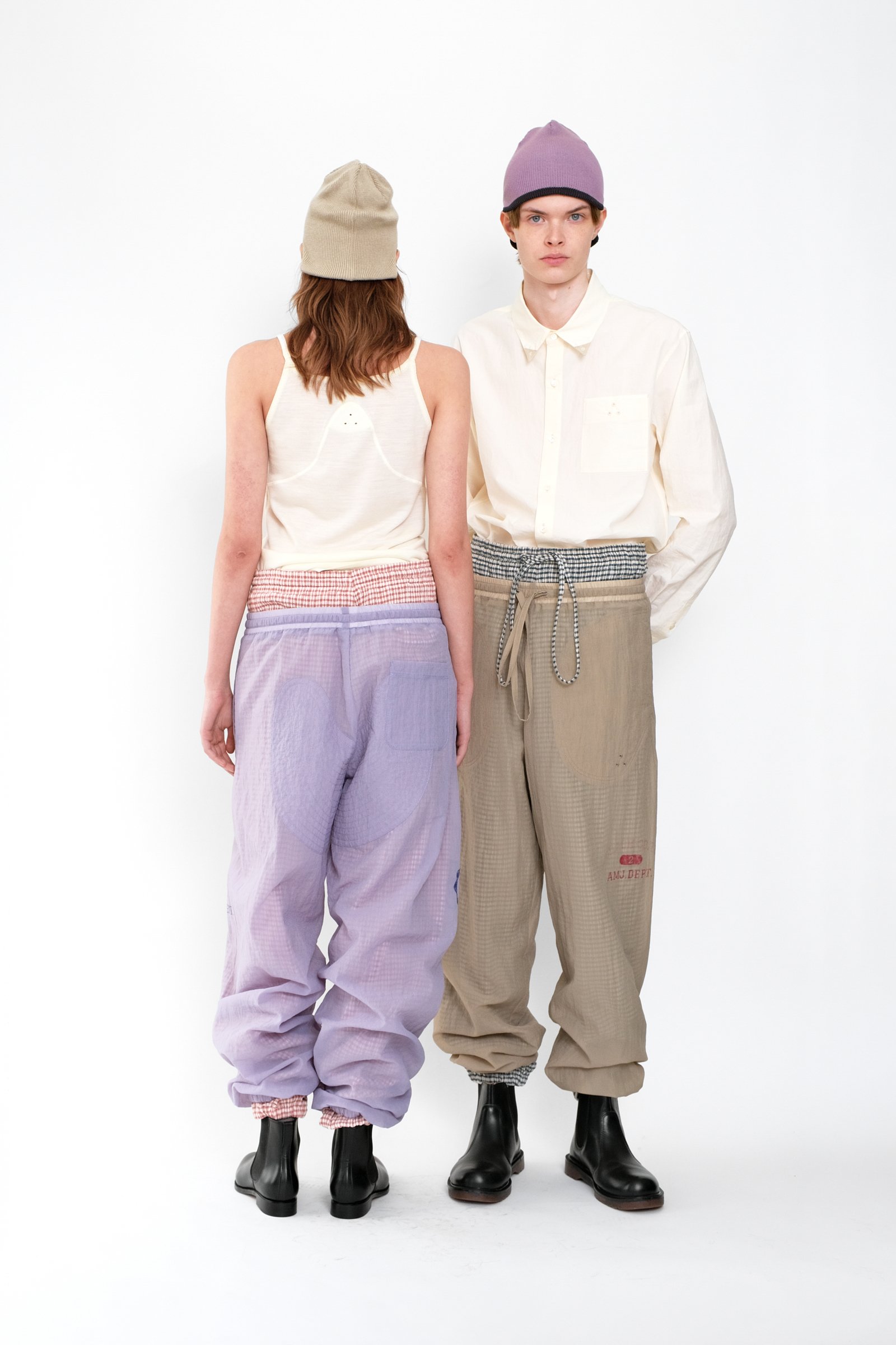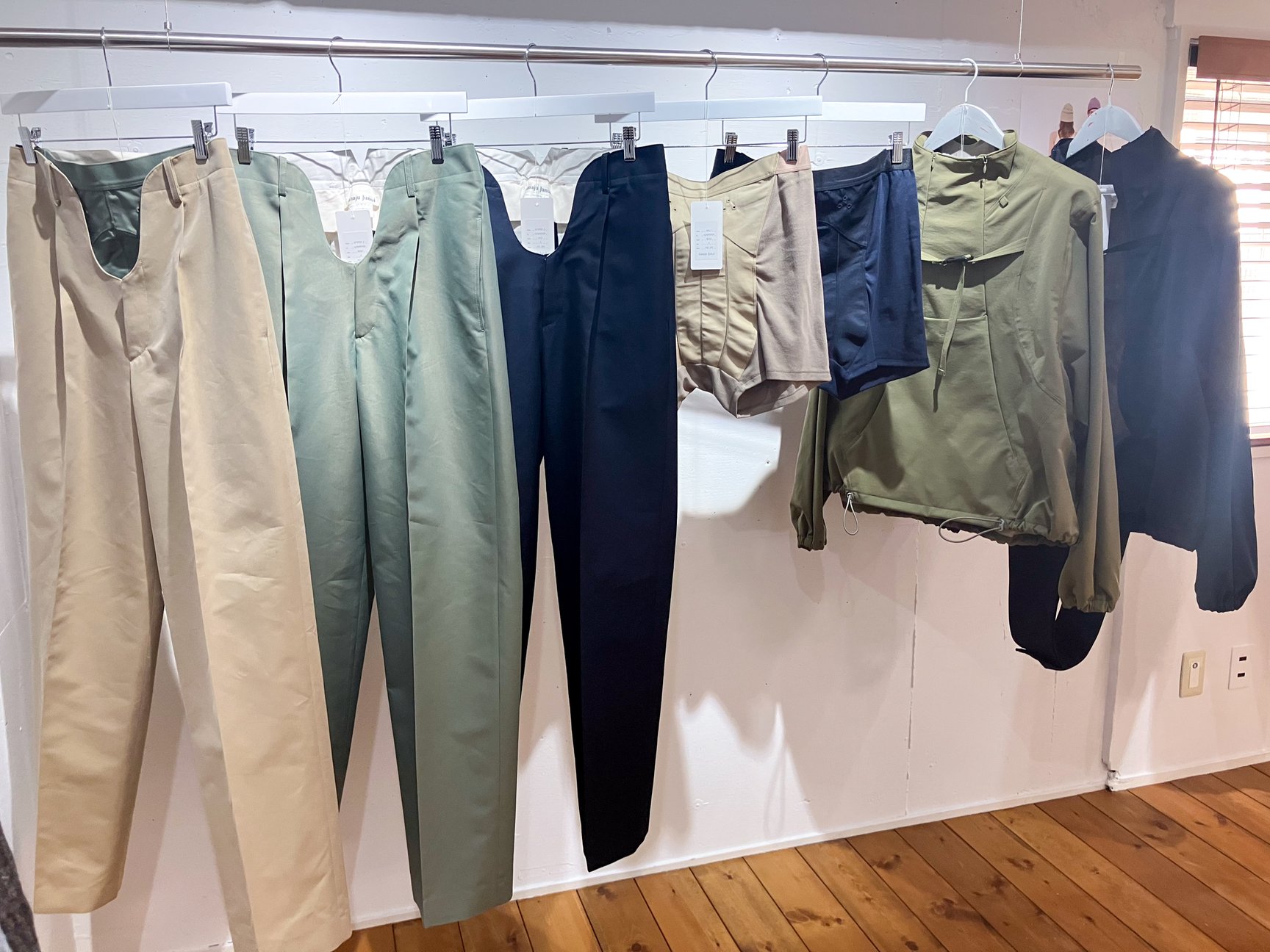 そのほか、股上部分がU字にくり抜かれ、共布のボクサーパンツ型アンダーウェアとのレイヤードを楽しむスラックスや、フロントとバックの長いコンシールファスナーを開け、前掛けのように垂れた部分を前後で繋げると「ふんどし」のようなスタイルになるブルゾン、雨の日のモンゴルで見かけた原付に乗る男性の“最悪な組み合わせ”の着こなしから着想を得た、透け感のあるスウェット型カバーパンツなど、実験的でプレイフルなアイテムも並ぶ。全てのアイテムにはそれぞれ「ALFRED」「STRAUSS」「RAM」といった名前が付けられており、「名前があることで、買ってくれた人にとって家族や友達のように愛される存在になってくれたら嬉しい」というデザイナーの願いを込めている。